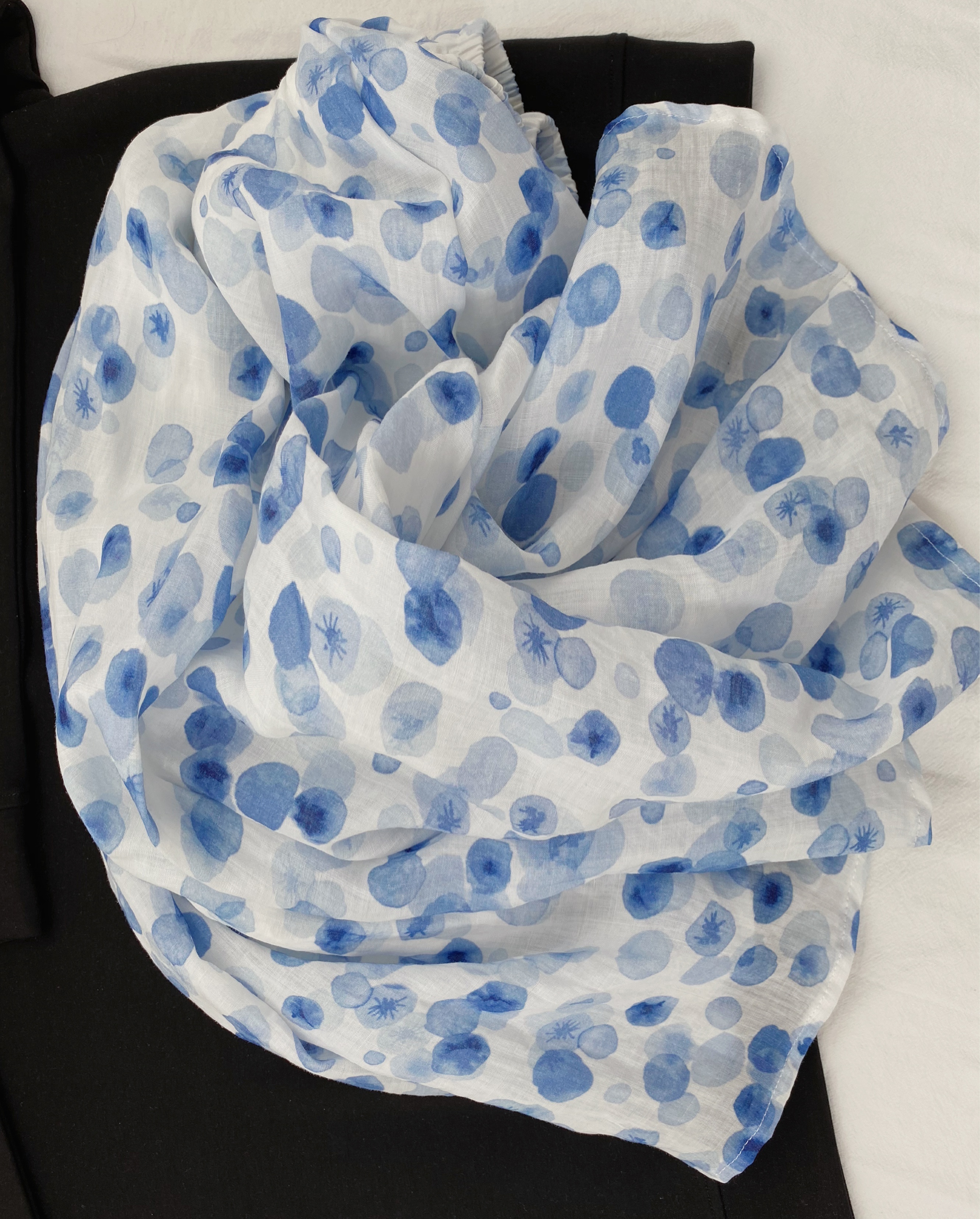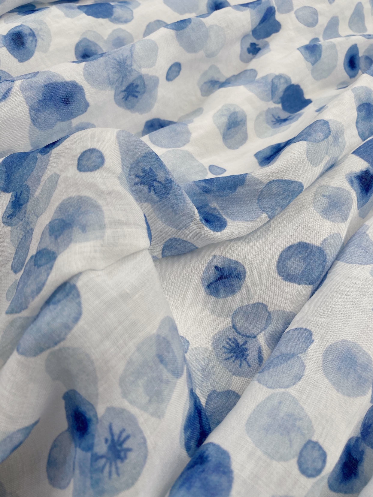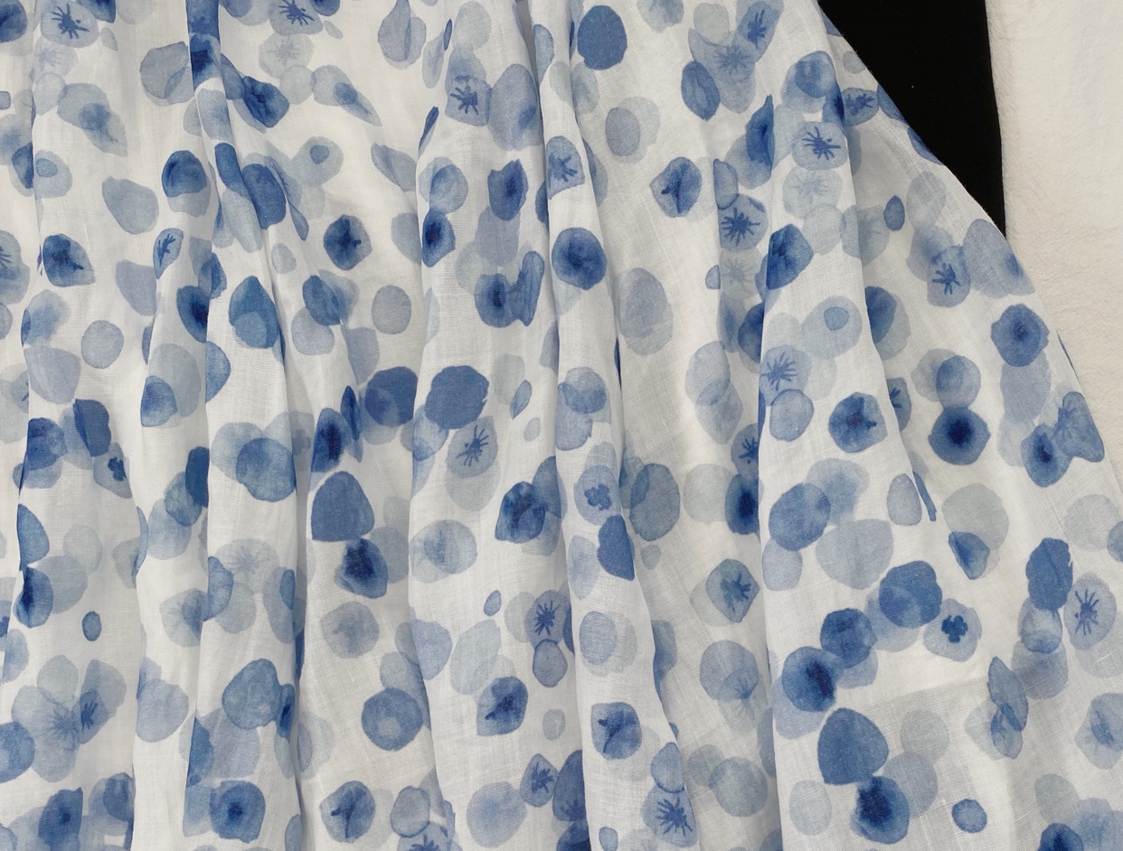 高定。水彩冰蓝色晕染印花纯天然苎麻a字中长款半身裙2021夏自制