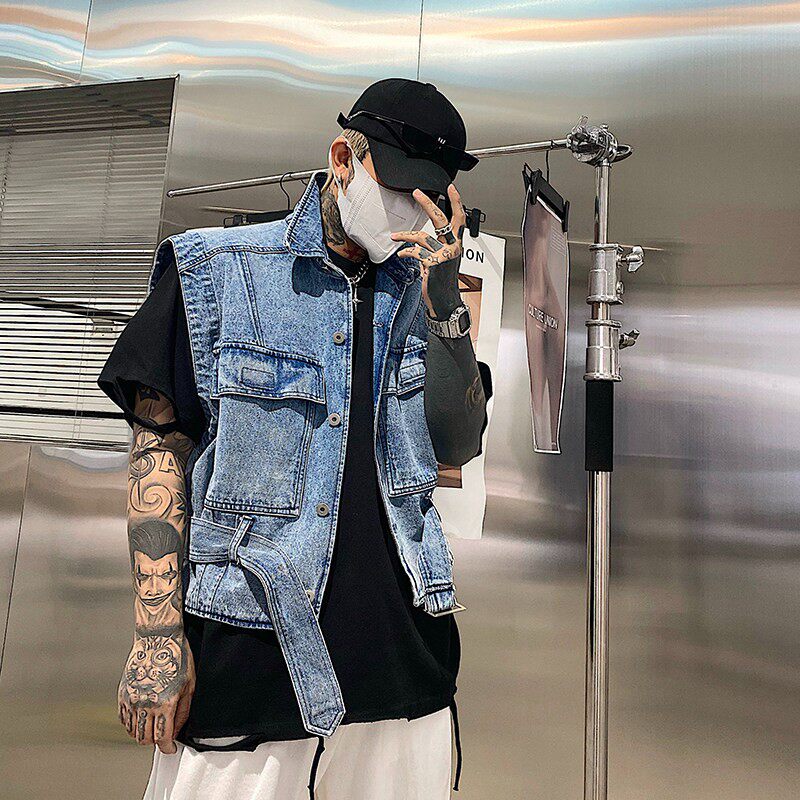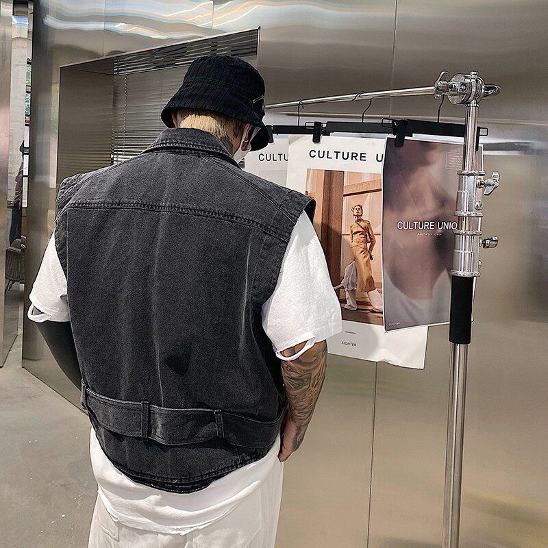 港风翻领工装牛仔马甲男潮牌痞帅坎肩大口袋背心夏季夹克无袖外套