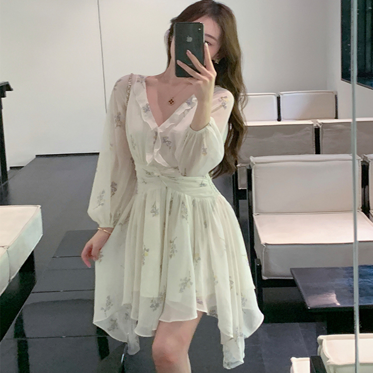 新款V领灯笼袖印花雪纺短裙子