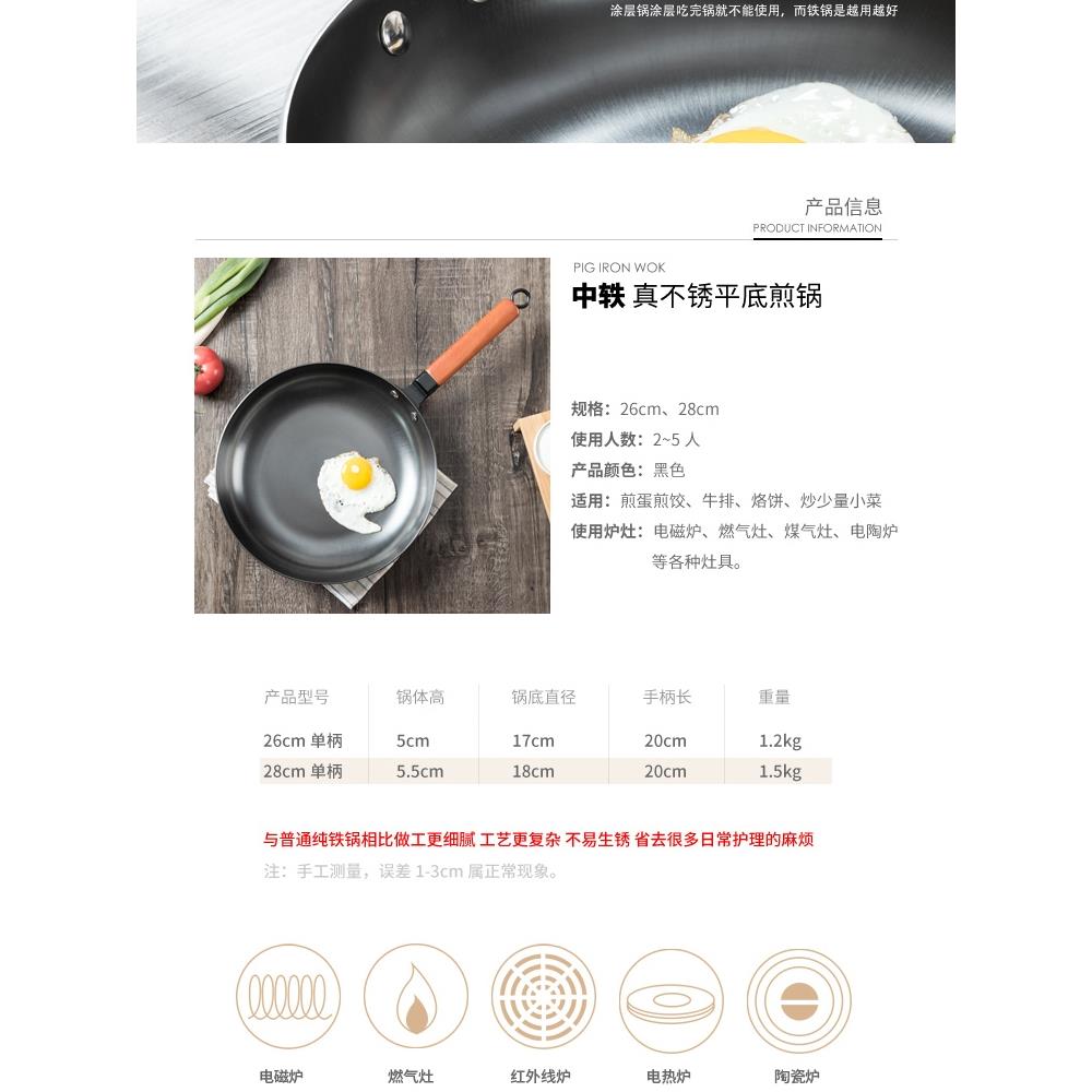 平底锅真不锈煎盘荷包蛋煎锅牛排锅纯生铁锅物理不粘锅无涂层