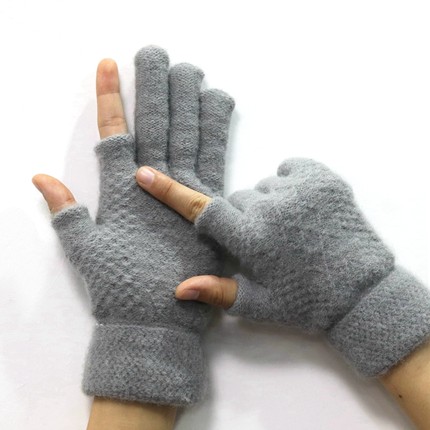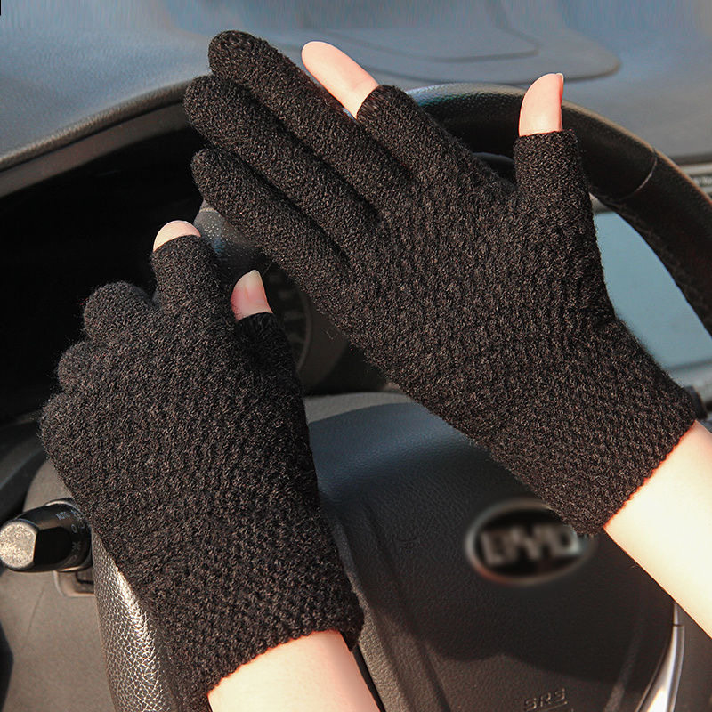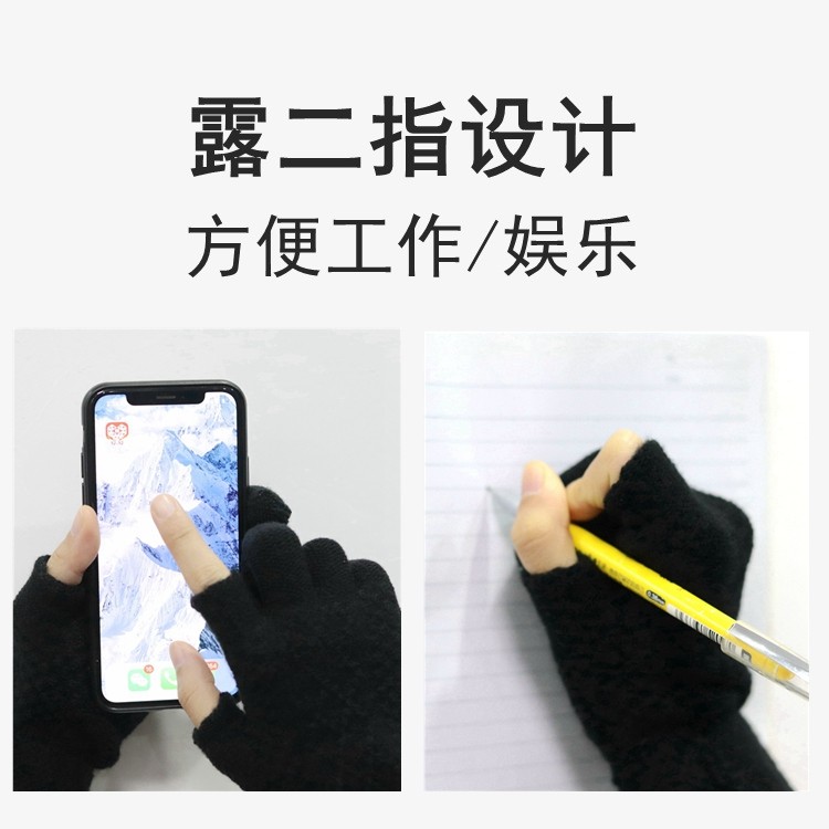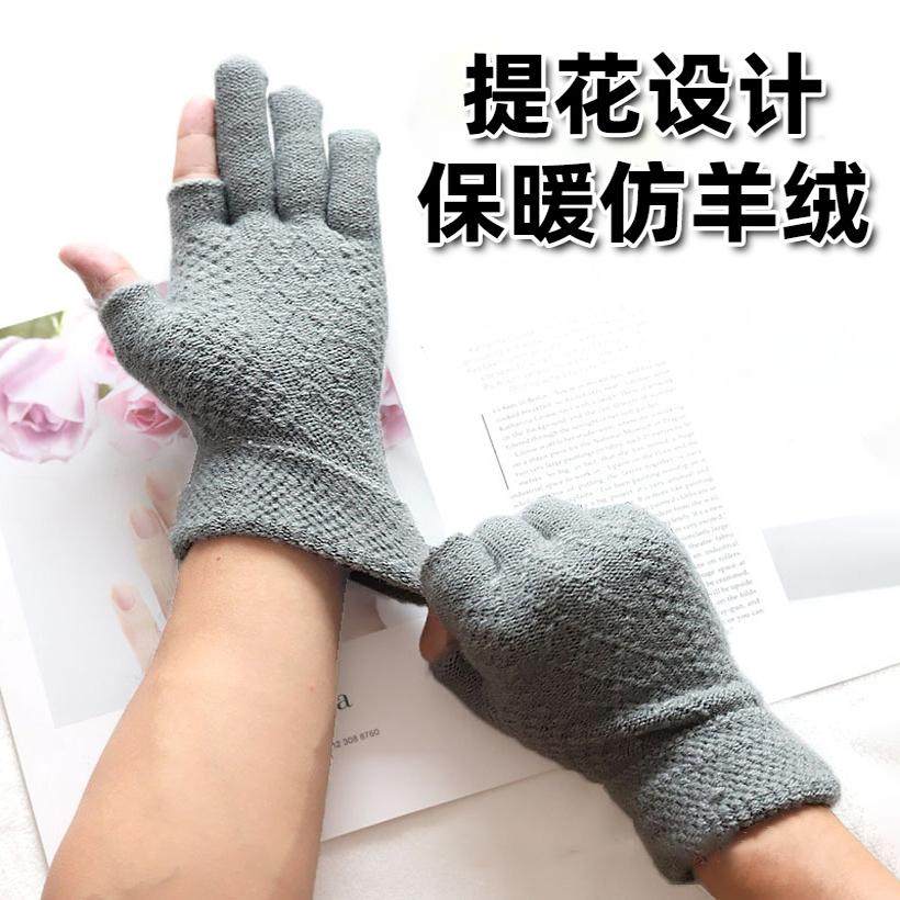 触屏手套男女士冬季保暖加绒加厚半指毛线写字学生露两指工作开车