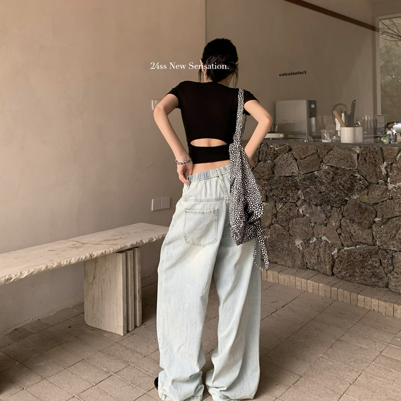 性感大U领露背小心机短袖T恤女夏辣妹正肩低领修身露腰短款上衣棉