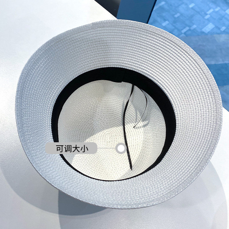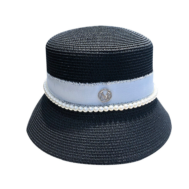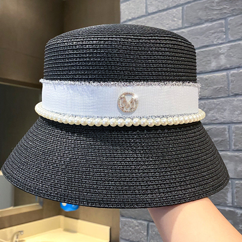 珍珠水钻M标草帽女夏季海边名媛小香风帽子遮脸渔夫帽防晒沙滩帽