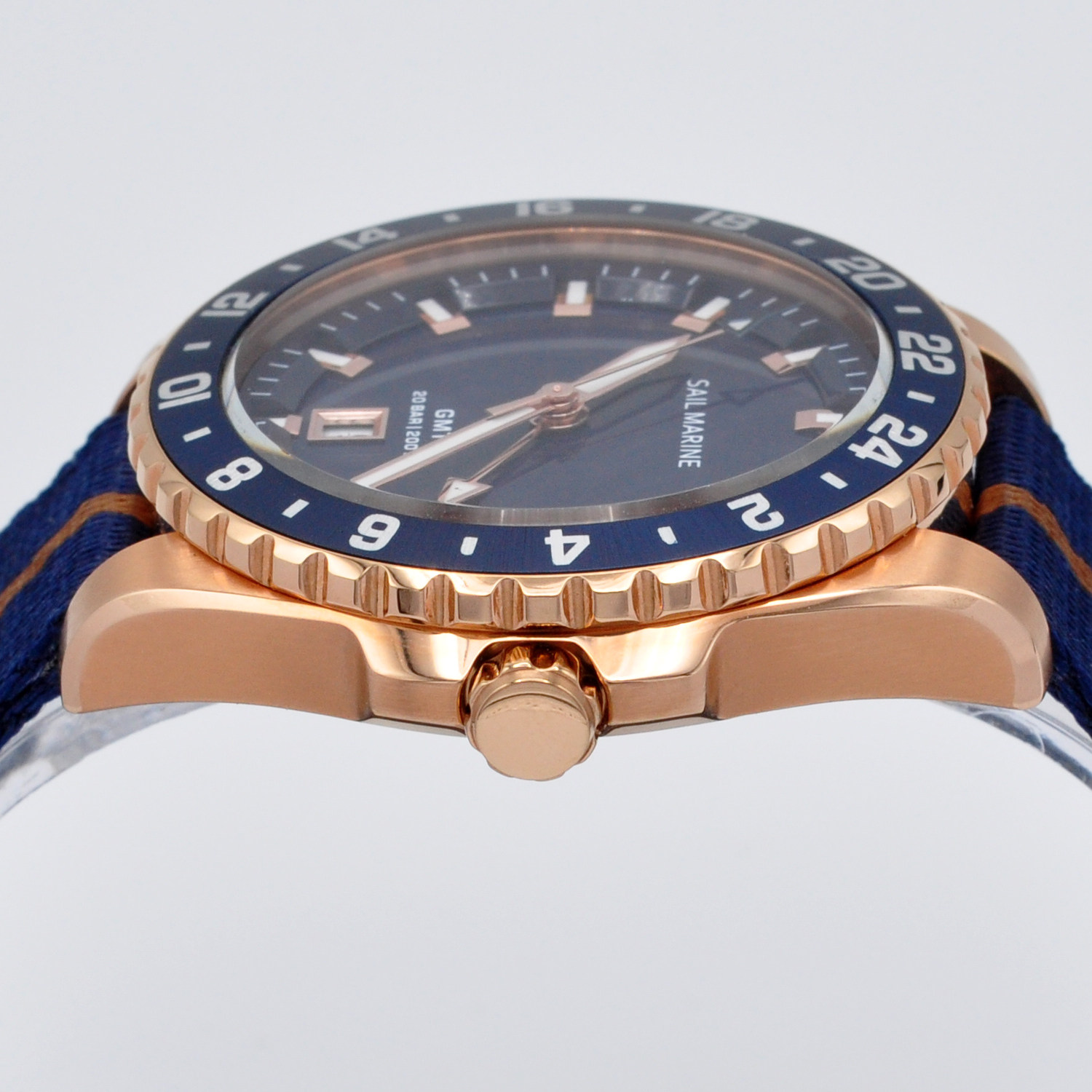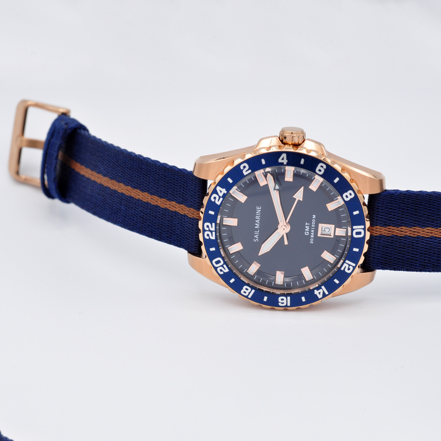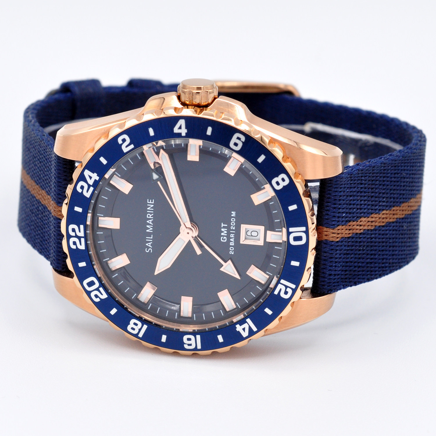 2026玫瑰金时尚强夜光男士手表帆布休闲表带GMT两地时高品质腕表