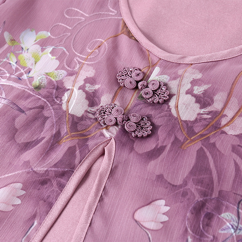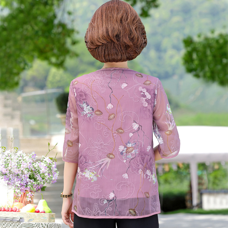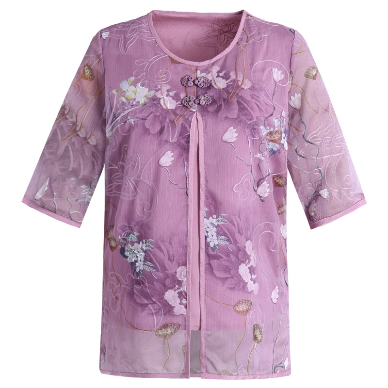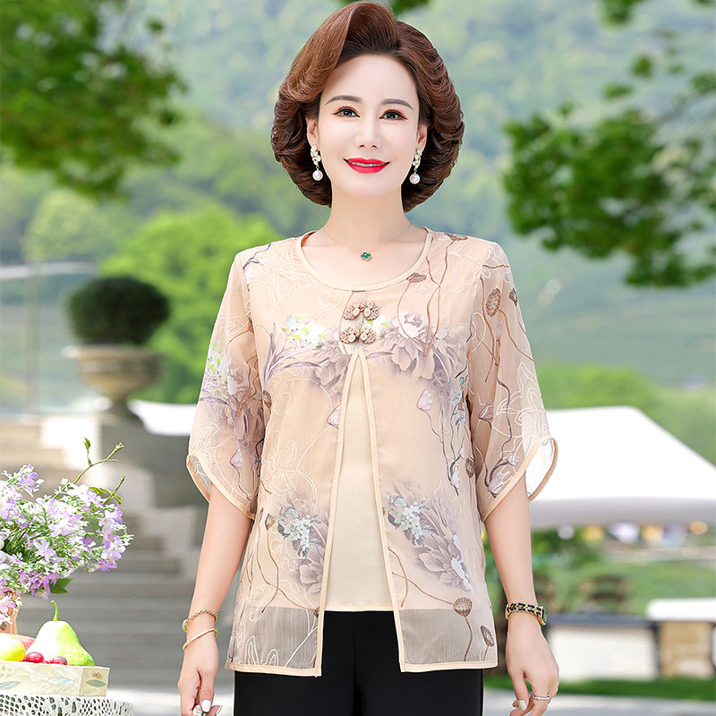 中年妈妈洋气套装短袖上衣时尚假两件雪纺衫中老年人女装新款套装