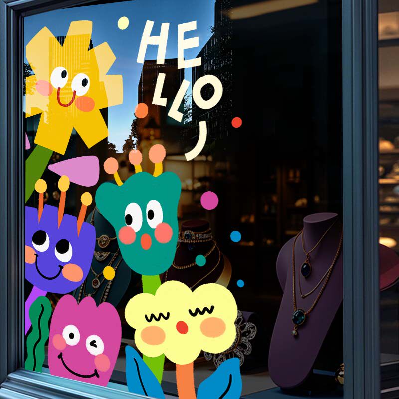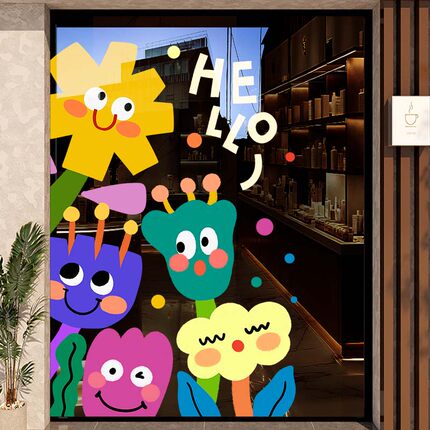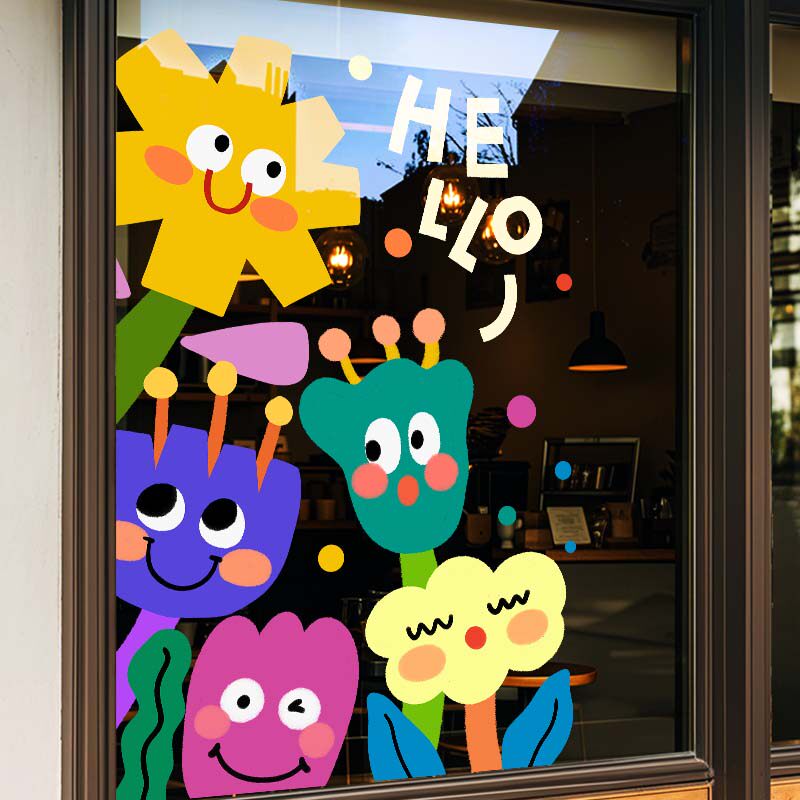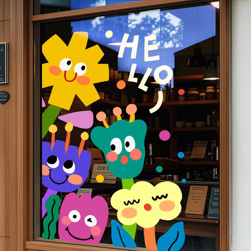 创意花朵玻璃贴纸店铺欢迎光临门贴画卡通可爱静电贴幼儿园装饰品