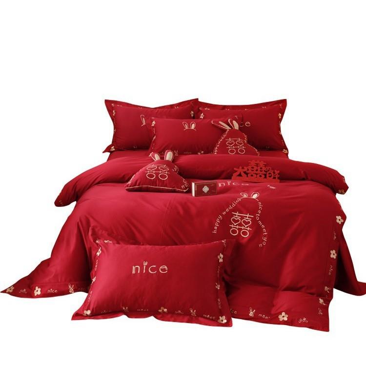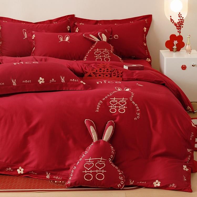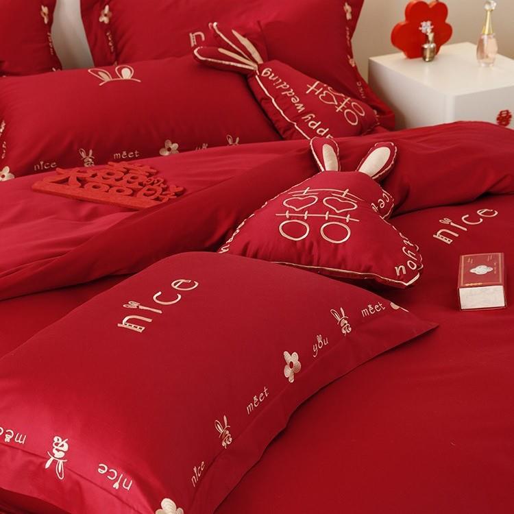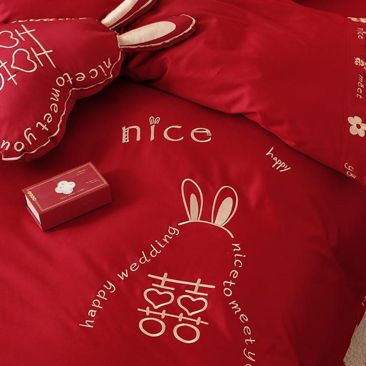 韩式婚庆四季长绒棉四件套兔子刺绣大红色纯棉被套结婚床上用品