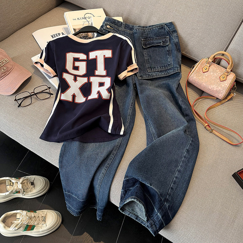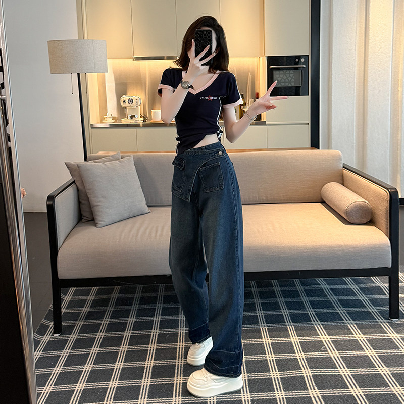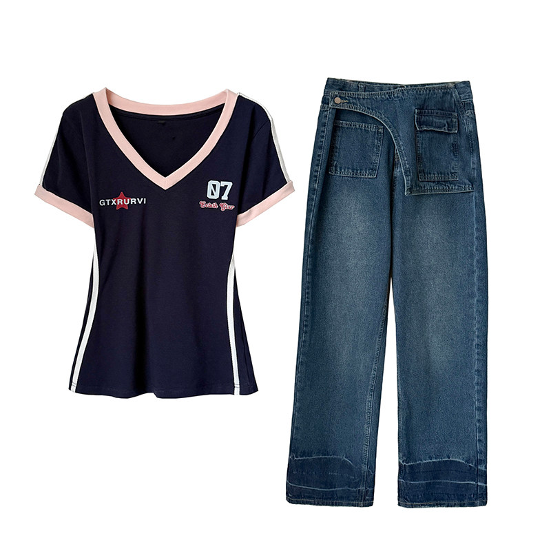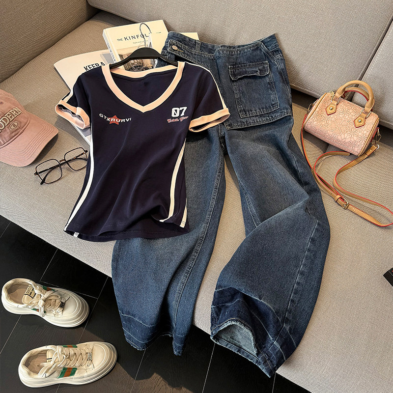 拼接阔腿特色牛仔裤套装女春夏V领T恤高腰显瘦设计感拖地裤两件套