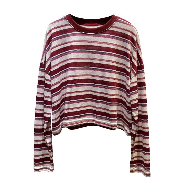 300斤大码日系撞色条纹t恤男女高级感圆领长袖套头打底衫短款上衣