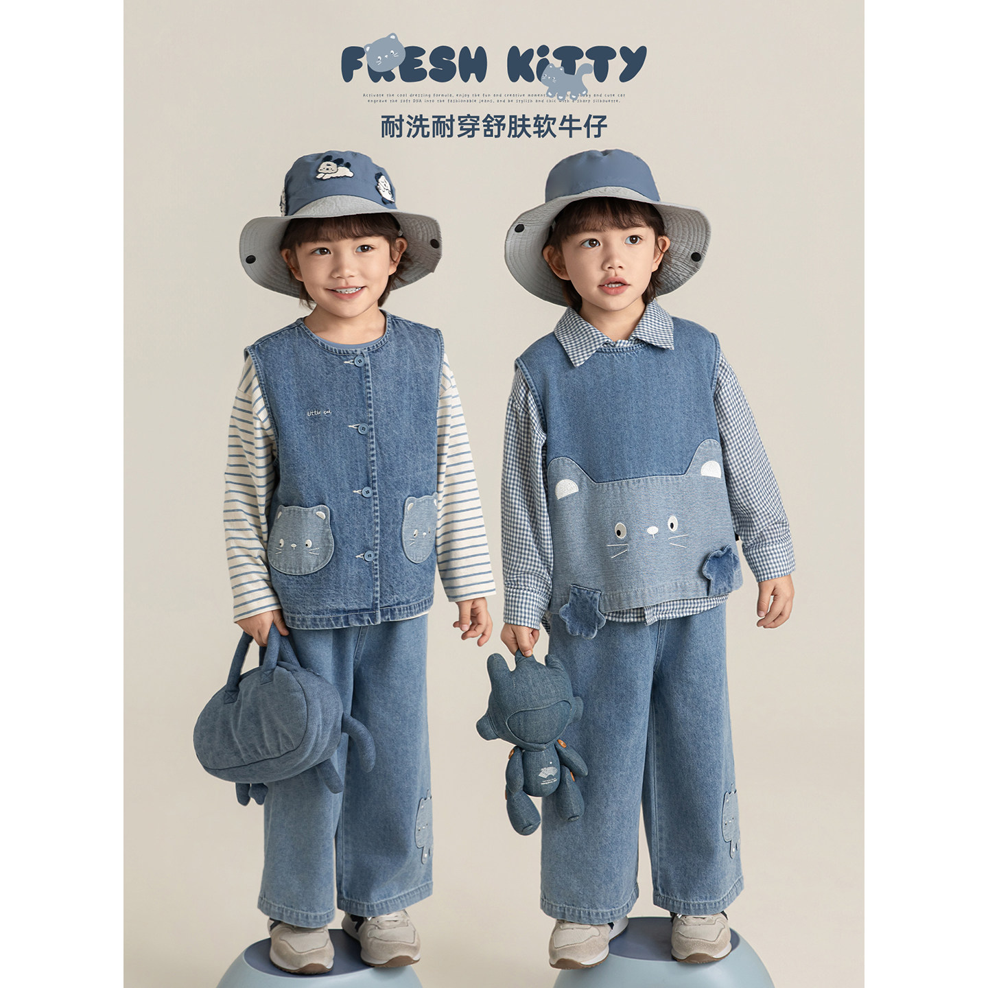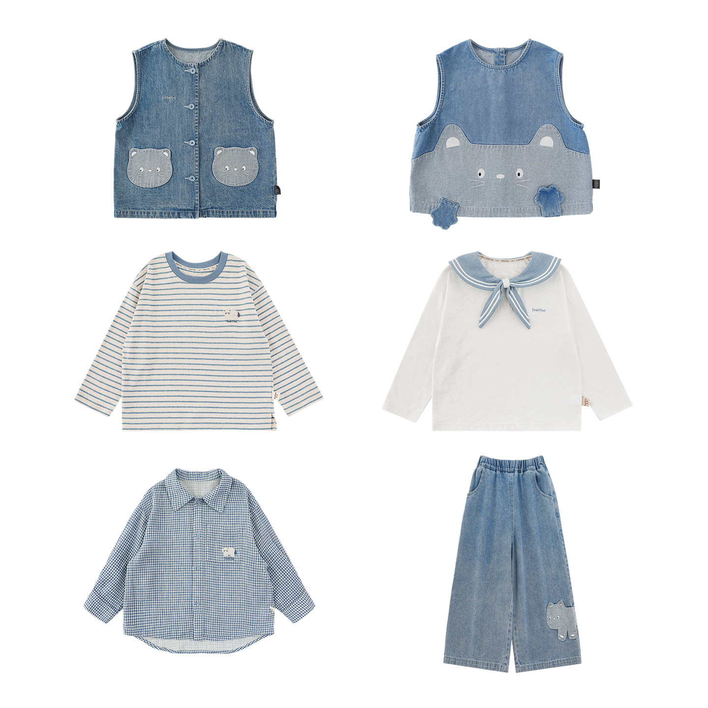 幼悠男童猫咪系列春季翻领休闲落肩衬衫显高显腿牛仔直筒裤多件套