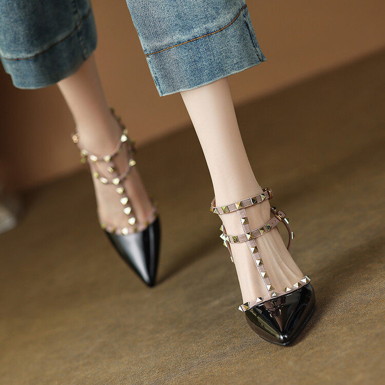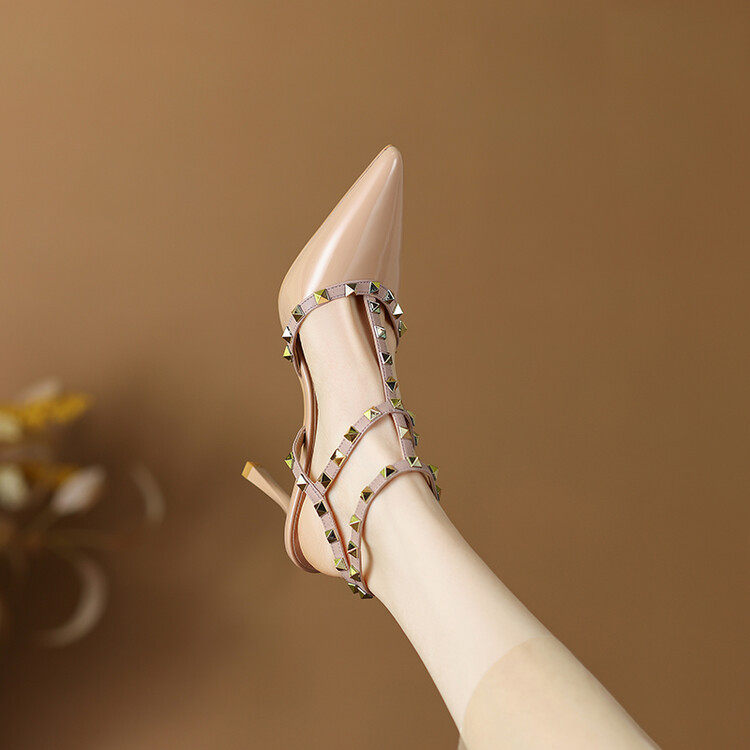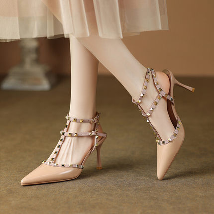 气质真皮漆皮铆钉尖头高跟鞋女2024春秋新款细跟包头凉鞋后空性感