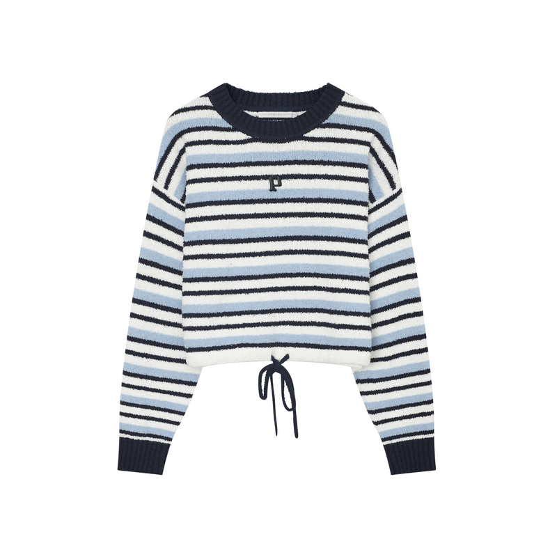 飘蕾条纹圆领针织衫女2024秋季新款减龄设计感抽绳甜美长袖毛衫