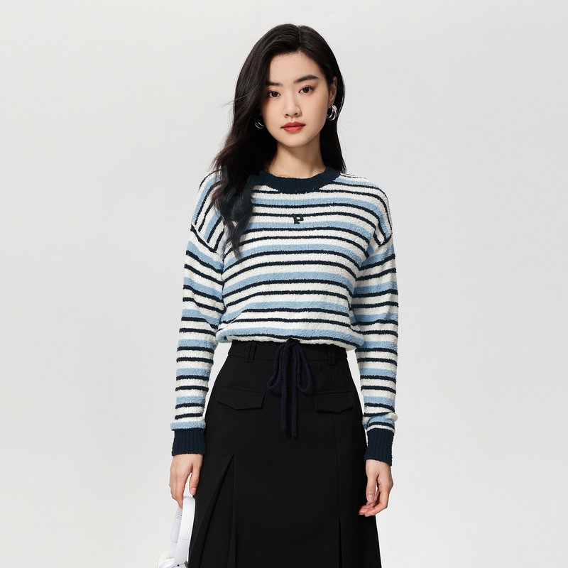 飘蕾条纹圆领针织衫长袖