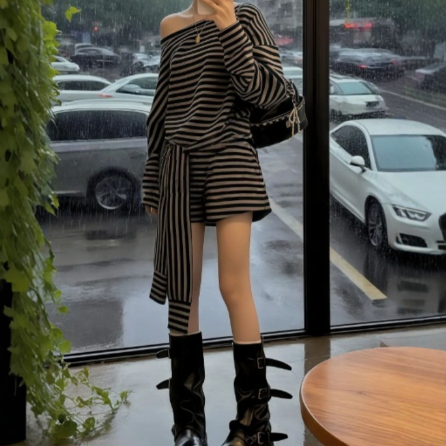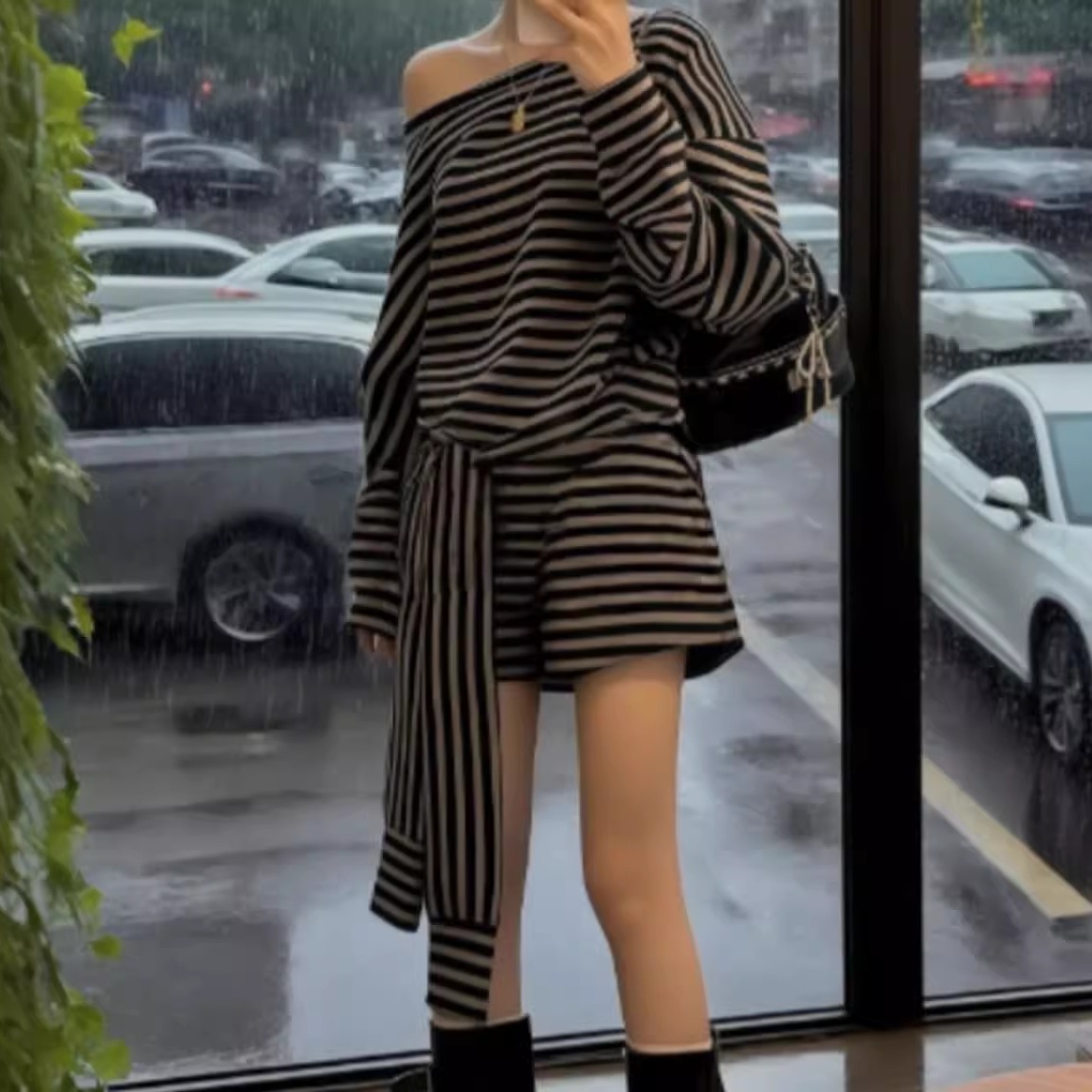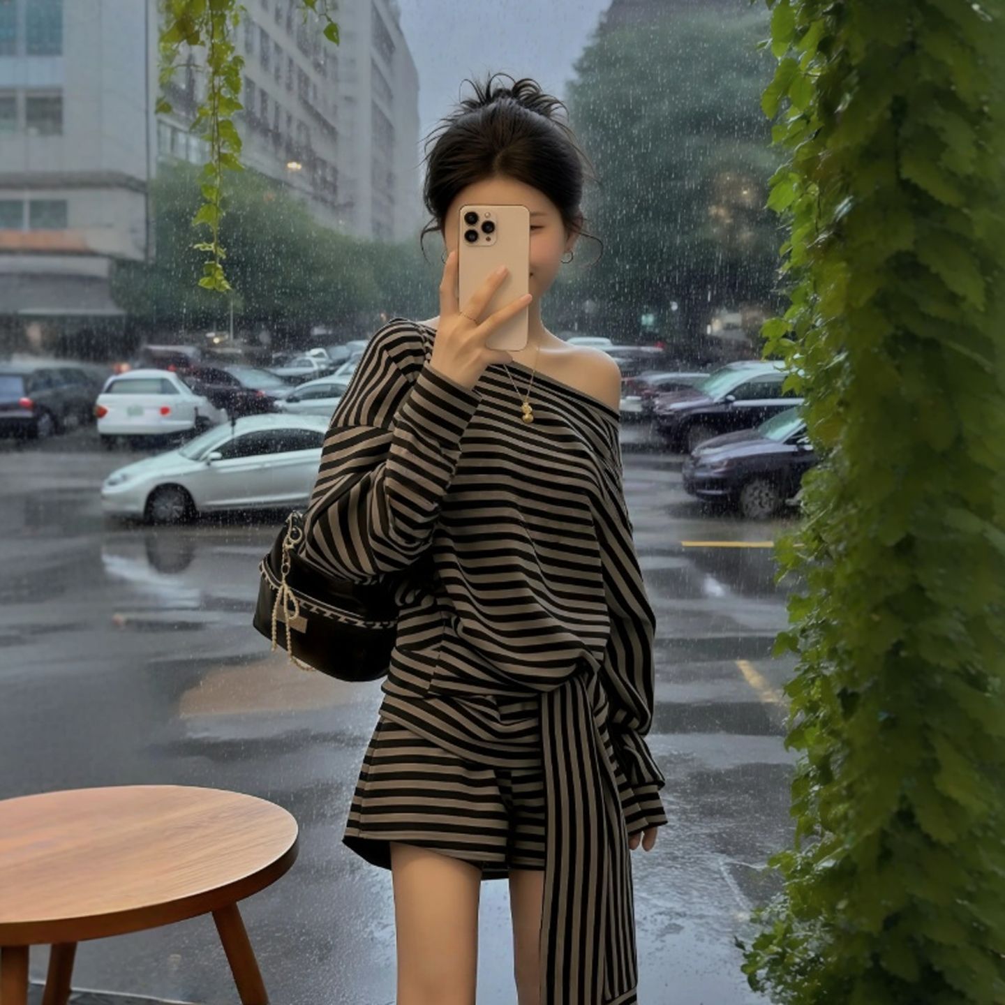松弛感穿搭一整套早秋独特超好看条纹上衣短裤套装女2025新款秋季