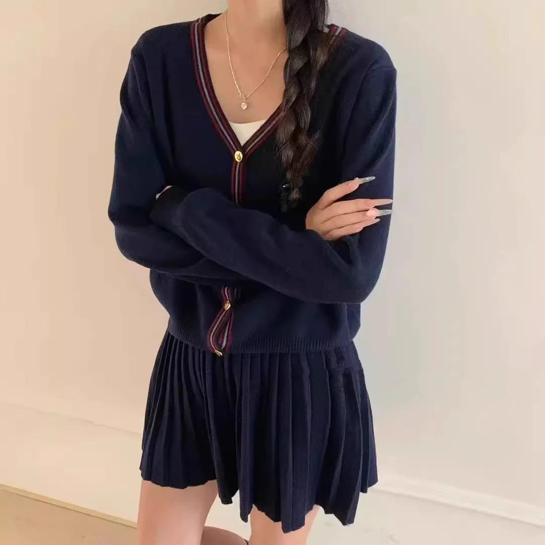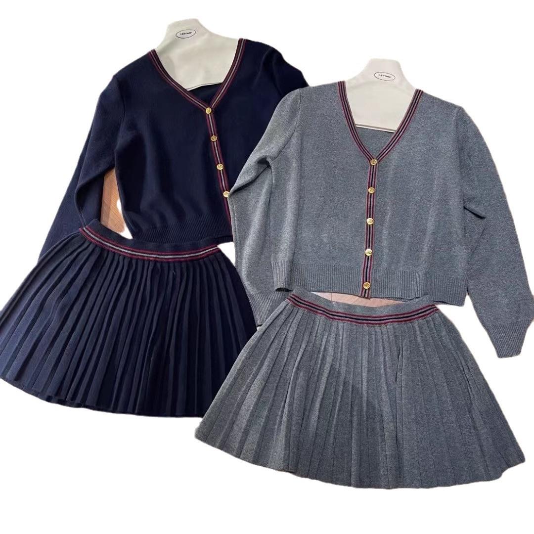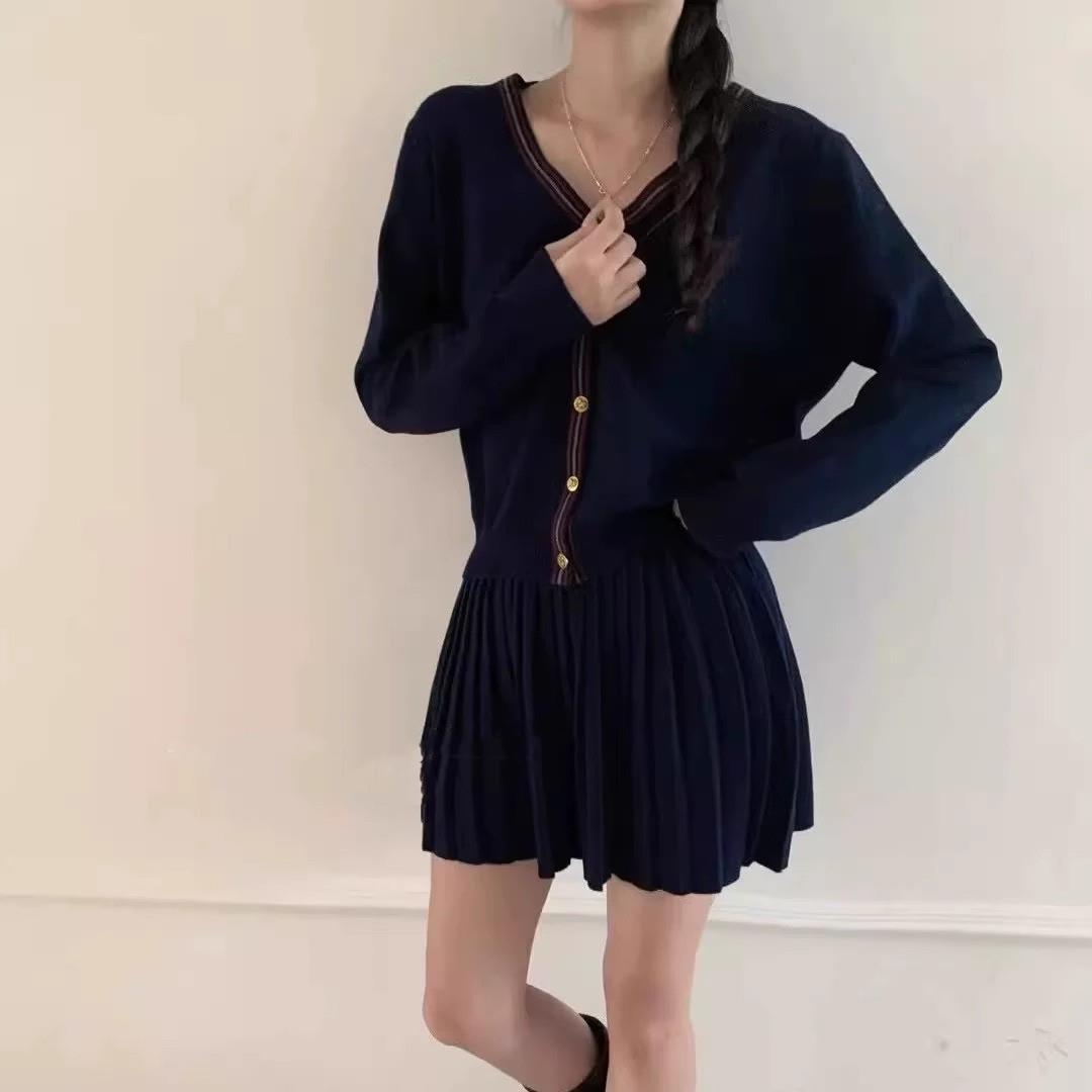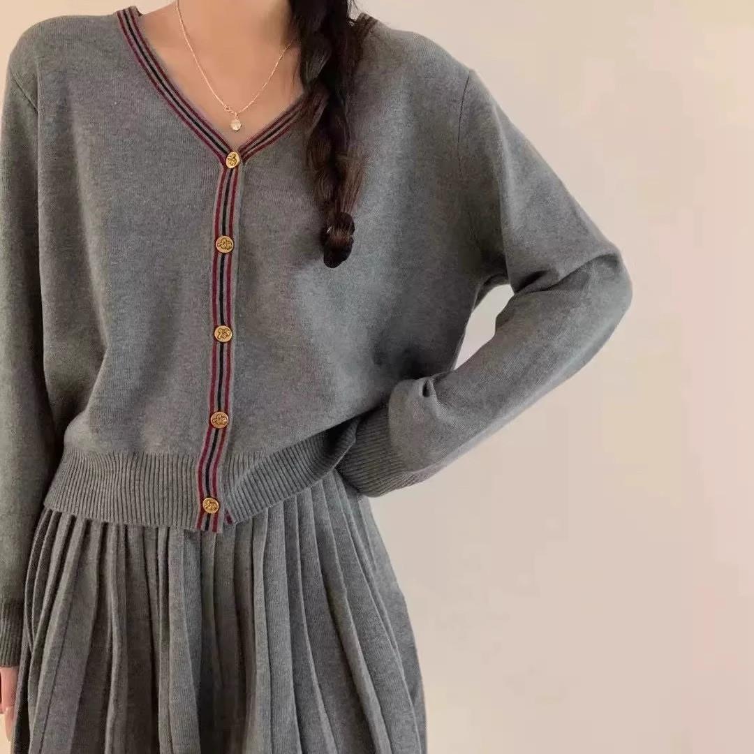 2025秋冬季新款V领撞色边针织开衫外套+灰色针织百褶裙半身裙两件