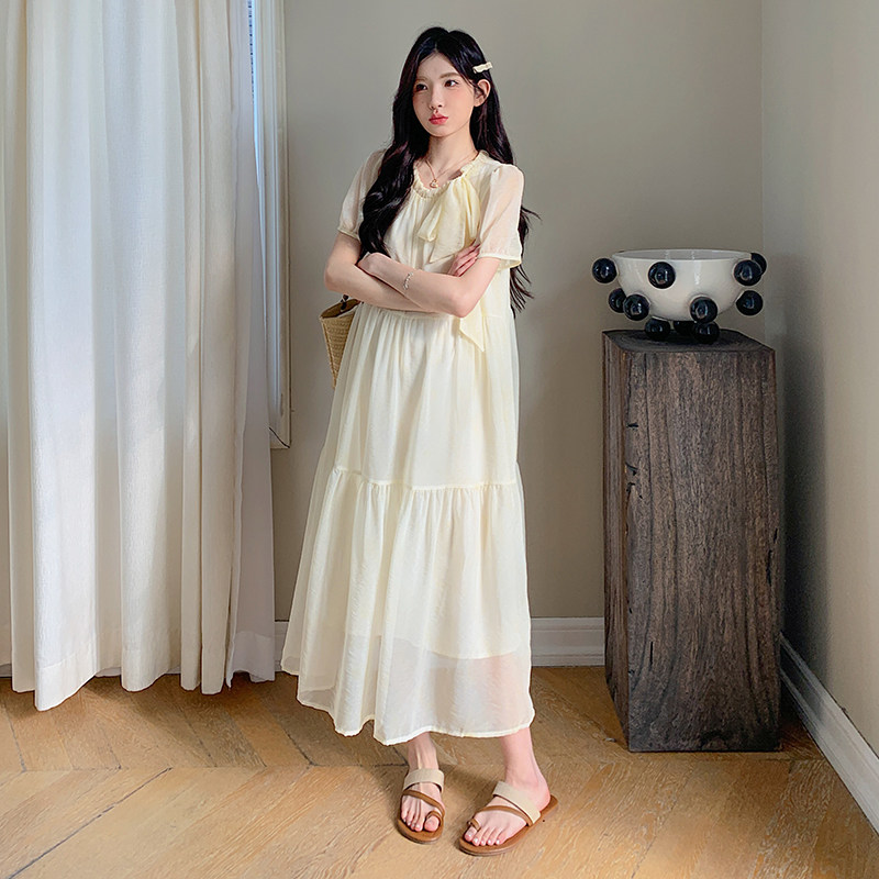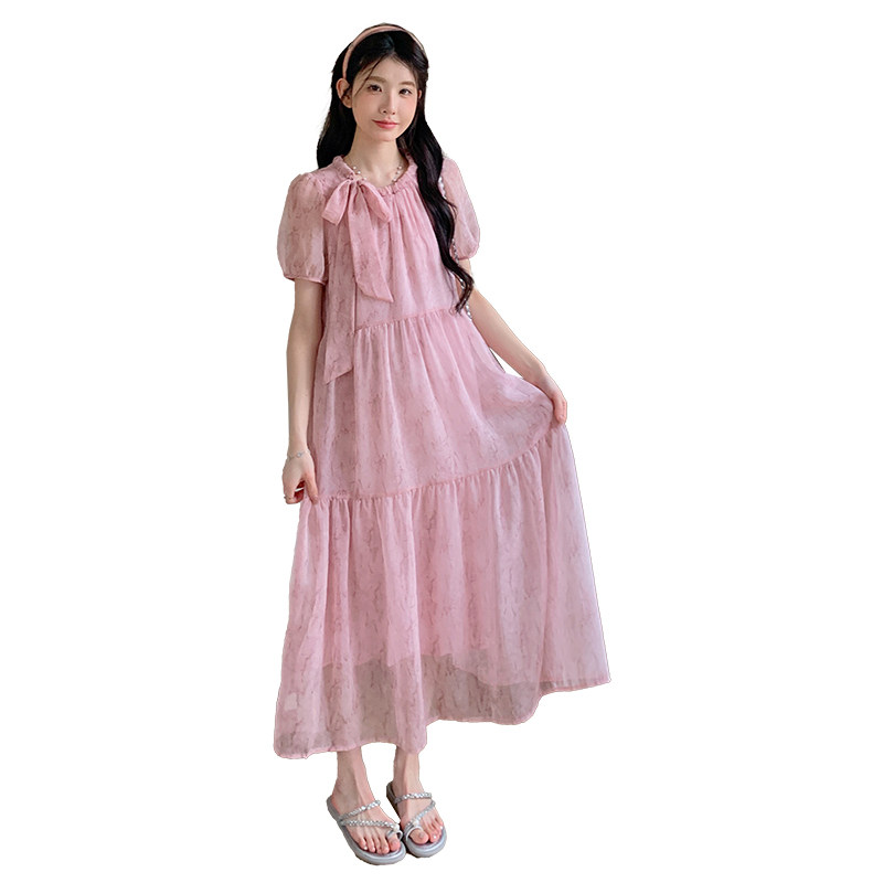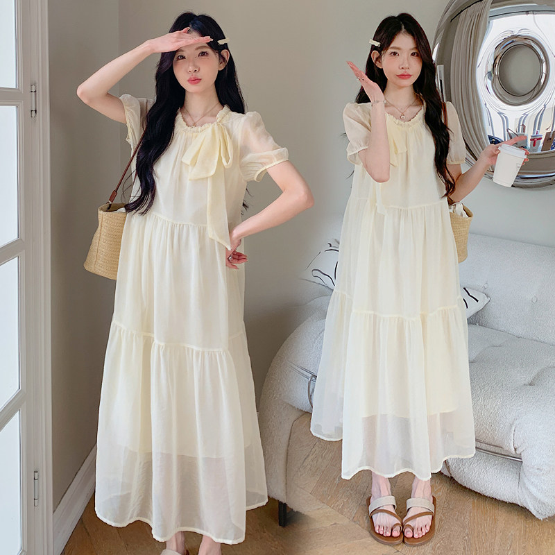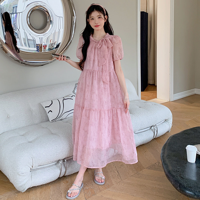 孕妇夏装连衣裙中长款甜美减龄孕妇装夏天刺绣雪纺圆领显瘦裙子女