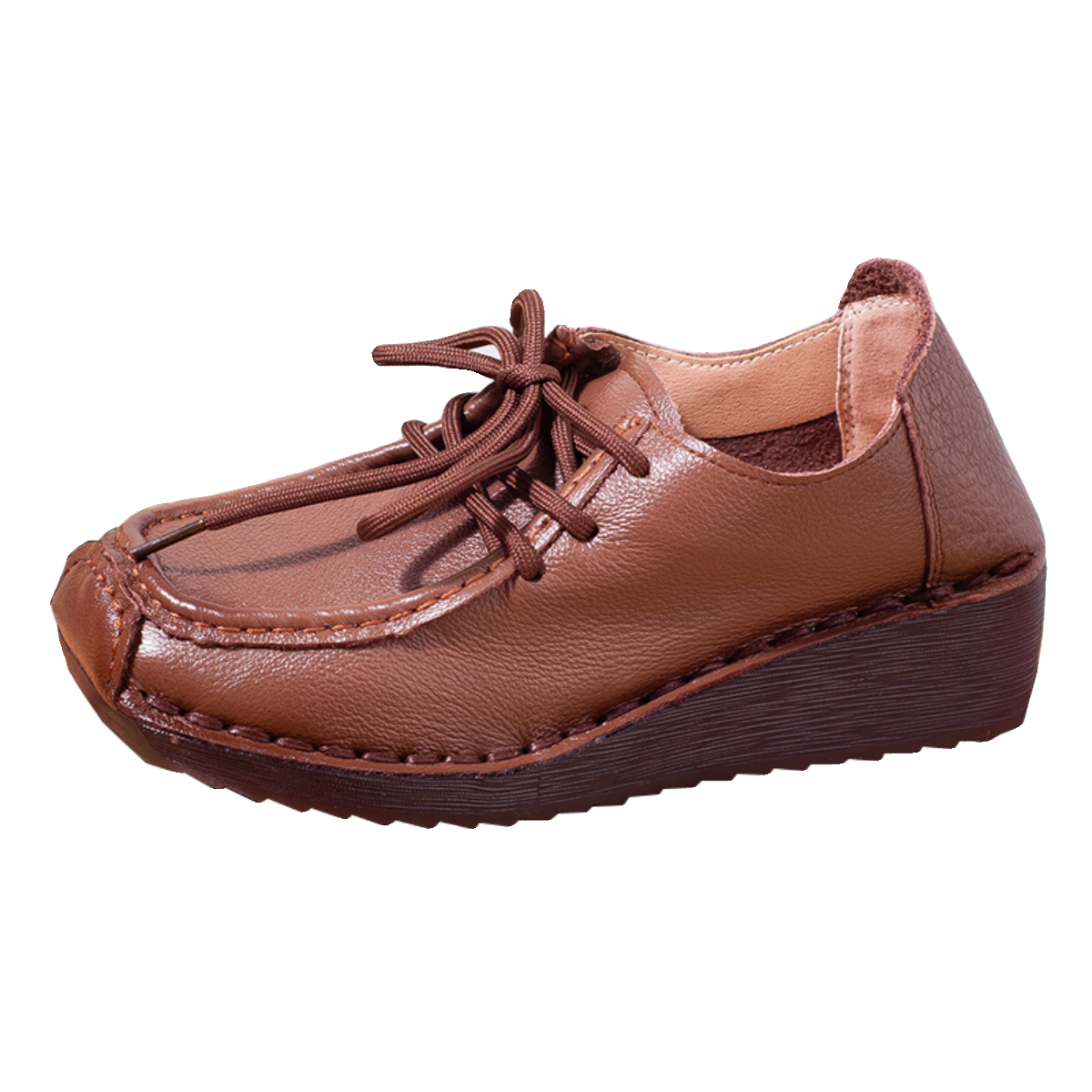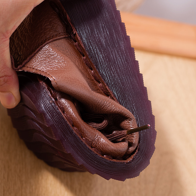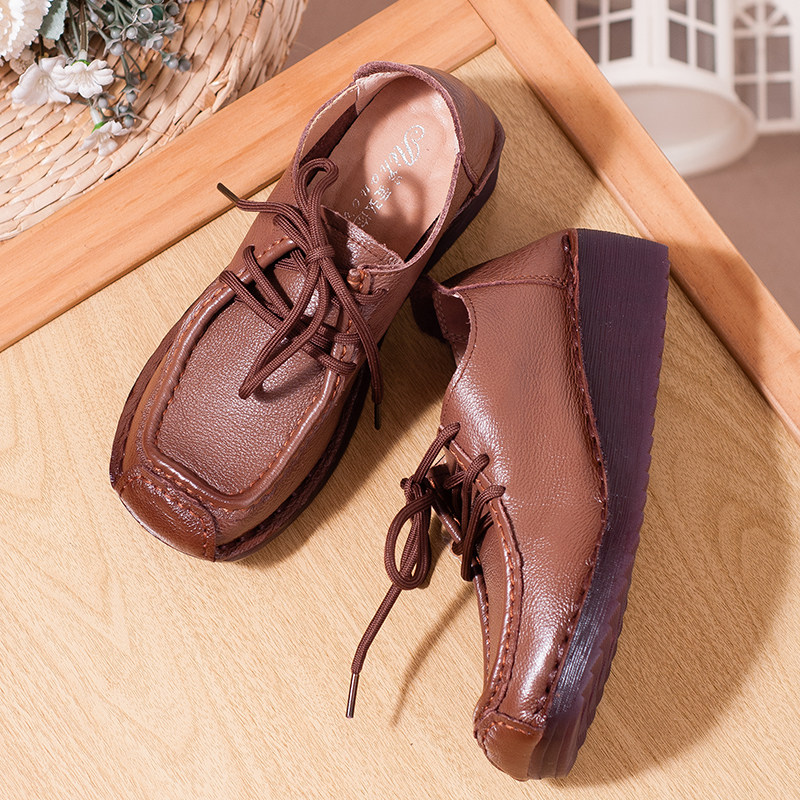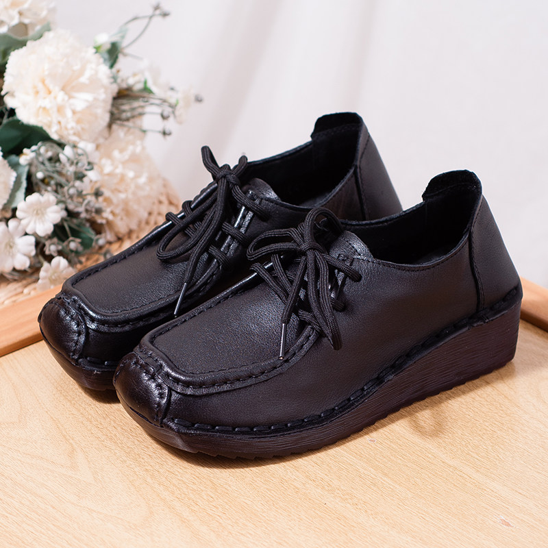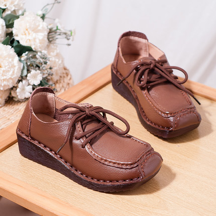 妈妈小跟皮鞋春秋新款真皮女鞋系带低跟坡跟单鞋软底中老年鞋防滑