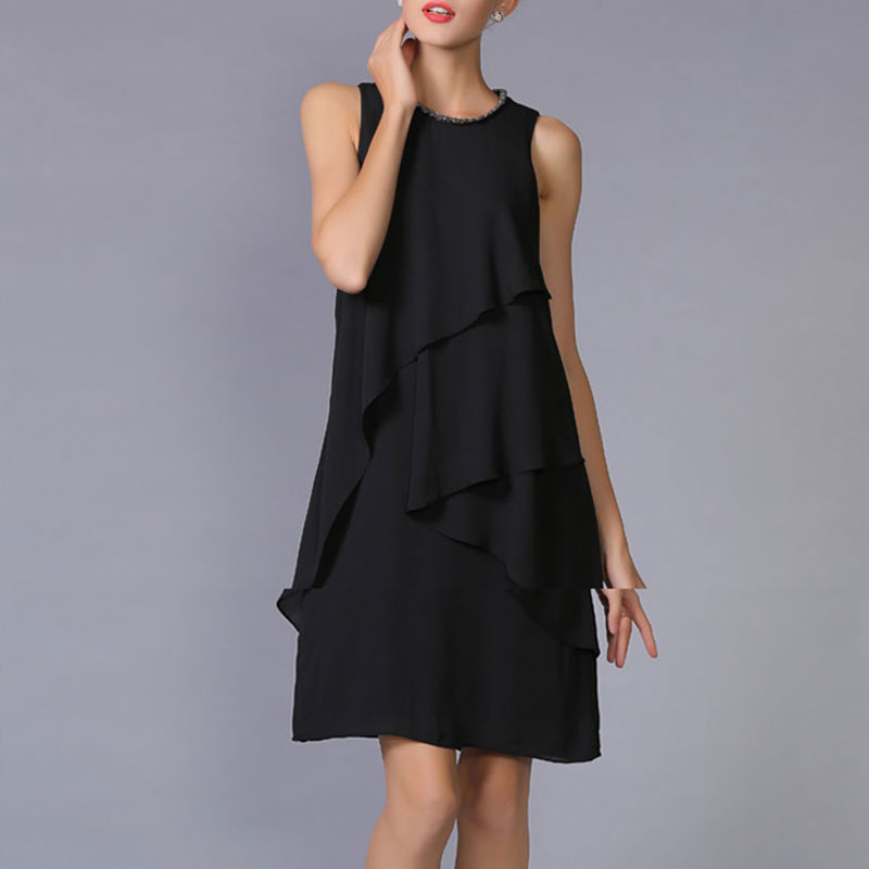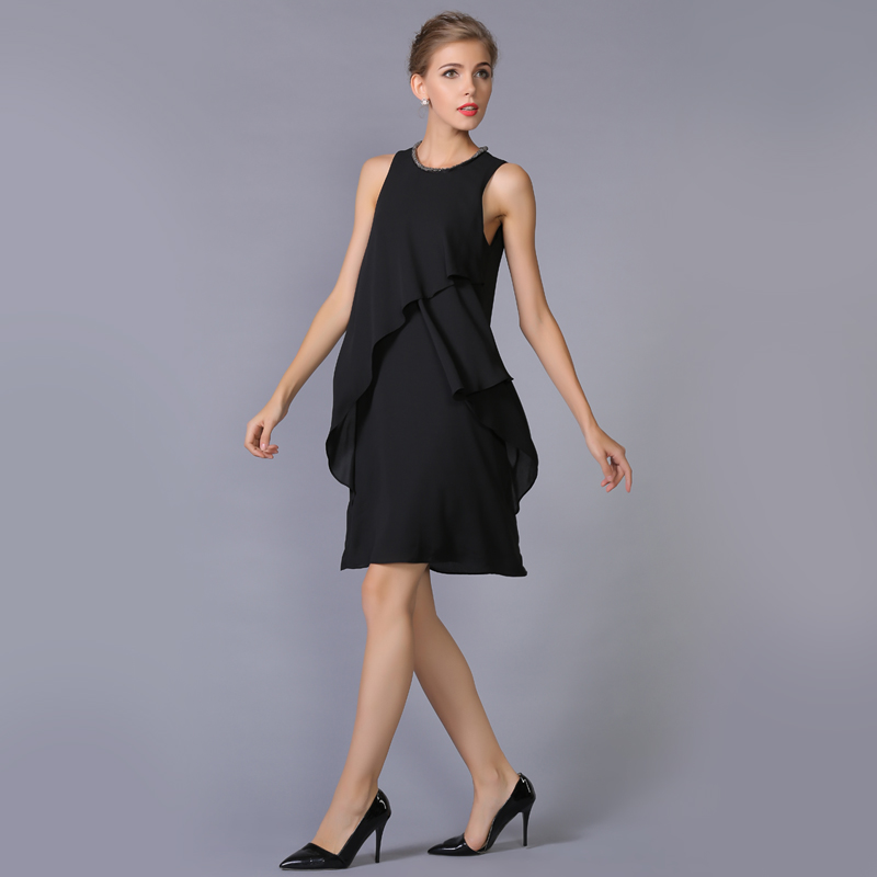 无袖背心吊带蛋糕挂脖式高端直筒a字黑色雪纺连衣裙女夏季小黑裙