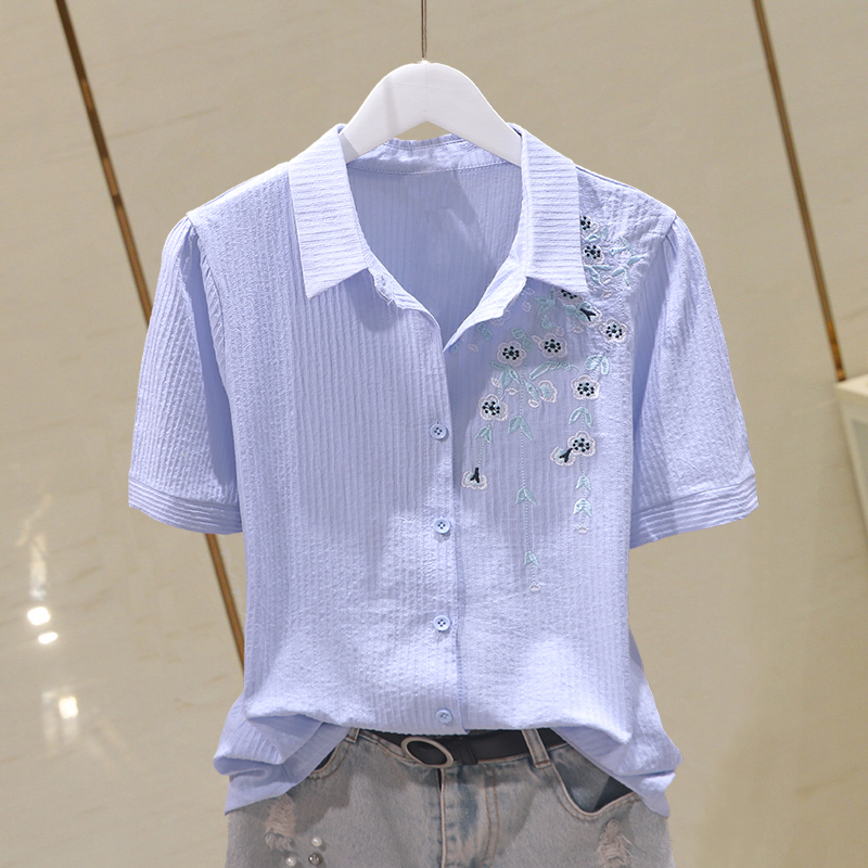 短袖棉布衬衫上衣女2025夏新款花儿刺绣坑条棉布打底时尚百搭小衫