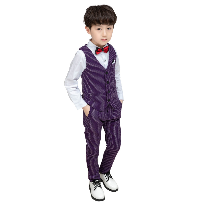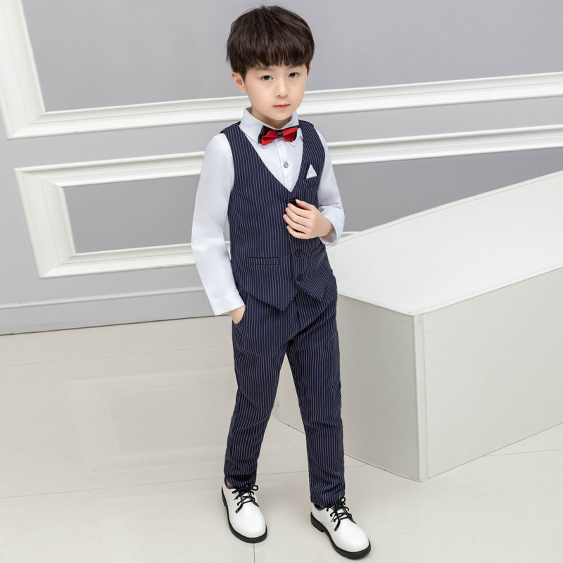极速2023春款童装新款潮男童条纹西装马甲M套装儿童韩版礼服三件
