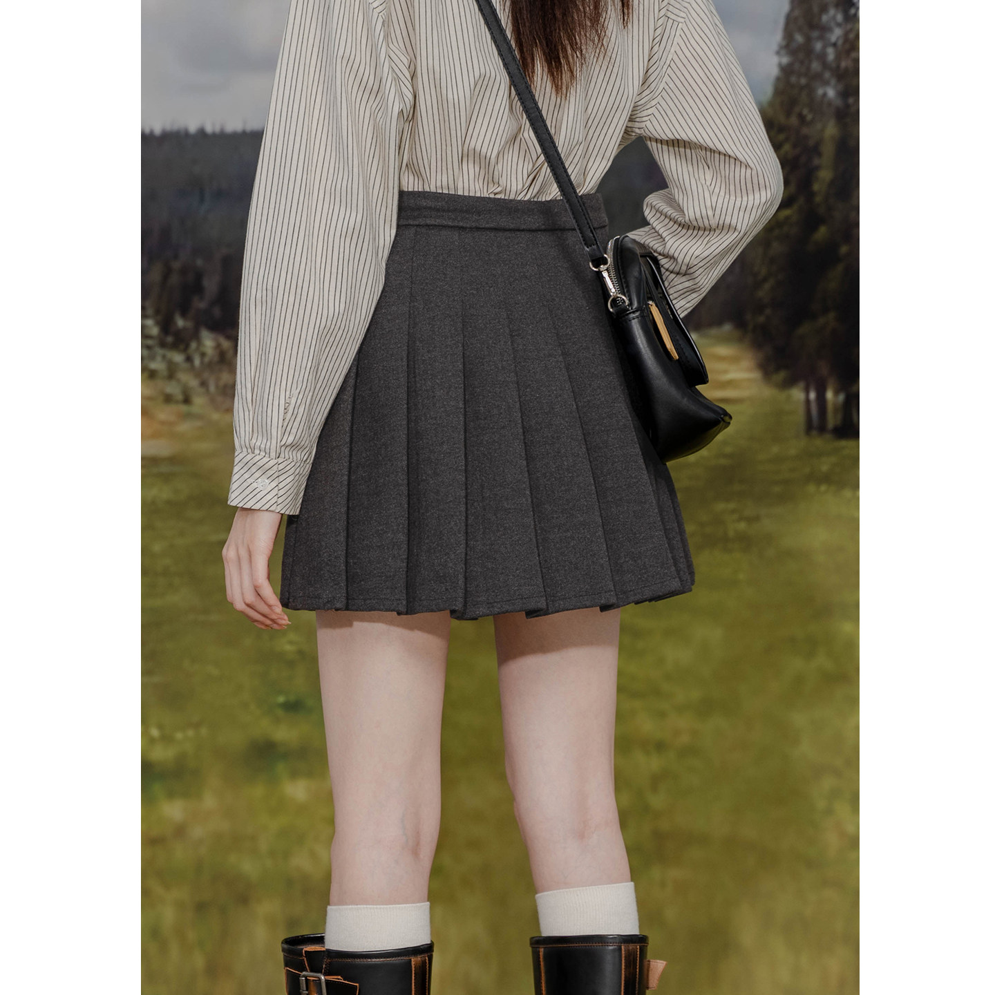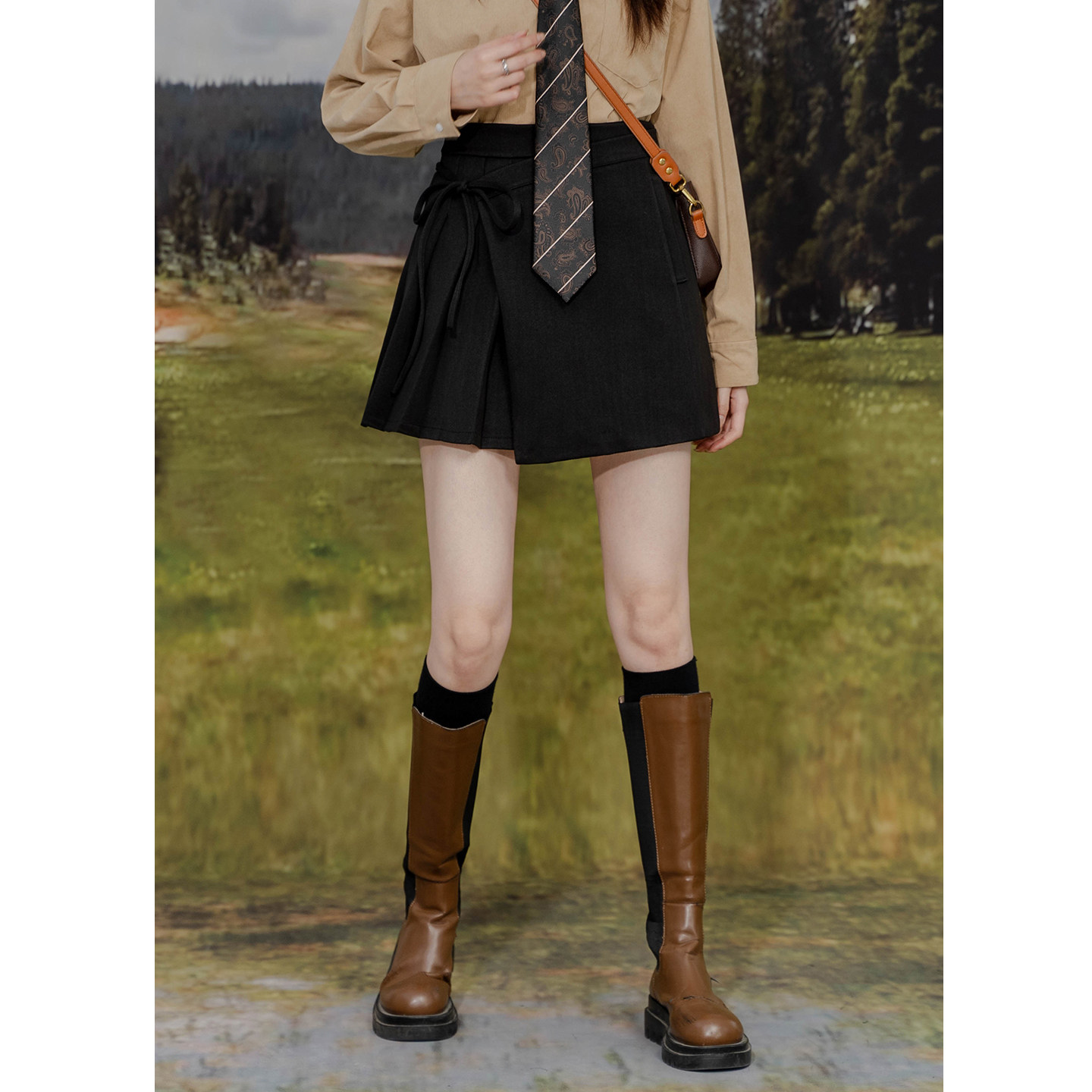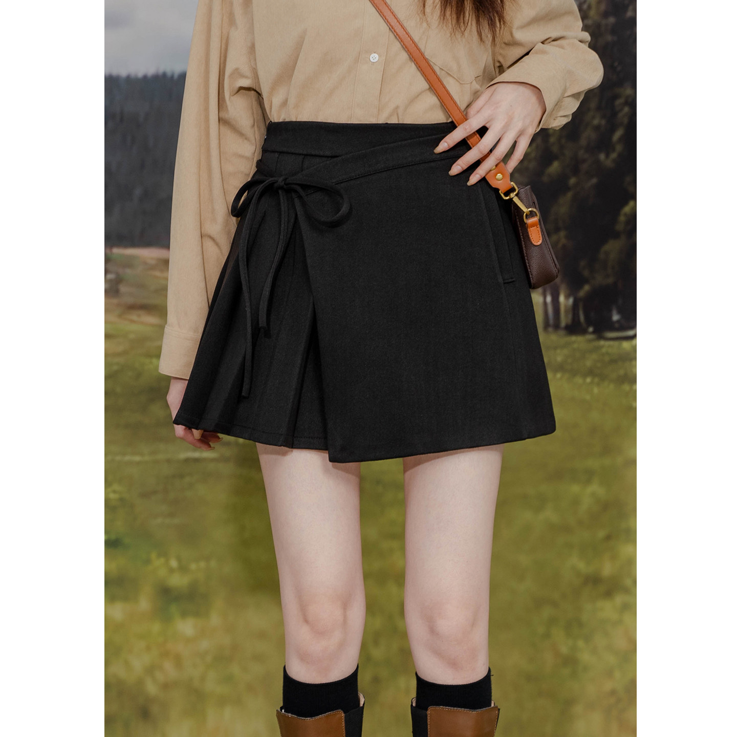 设计感不对称毛呢半身裙高腰A字绑带百褶裙简约气质显瘦呢子短裙