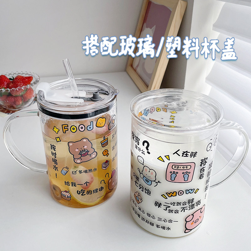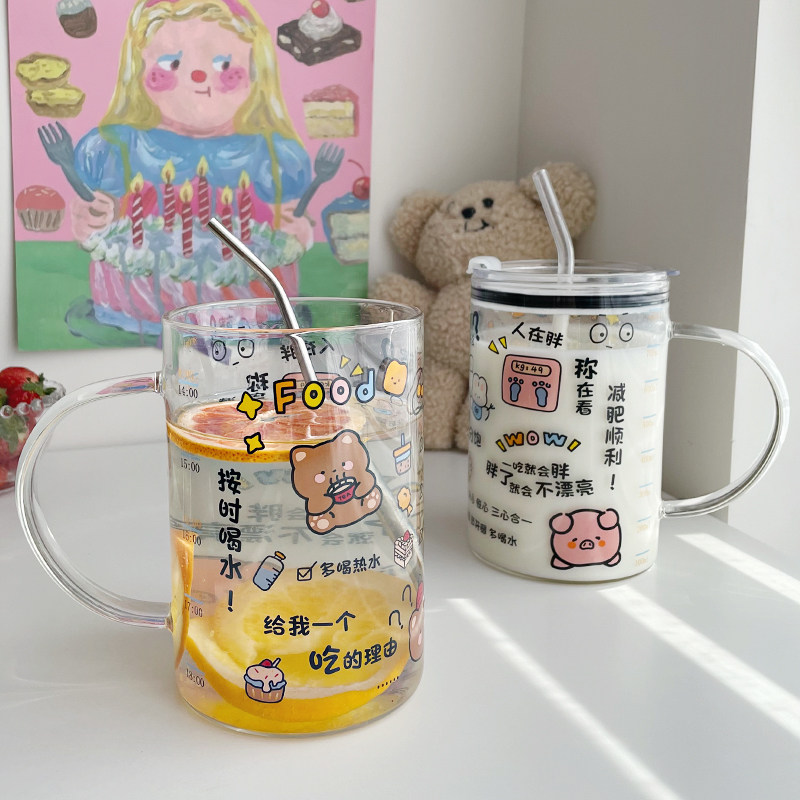 玻璃杯大容量1L水杯可爱刻度喝水大杯子办公室带盖吸管杯耐热水杯