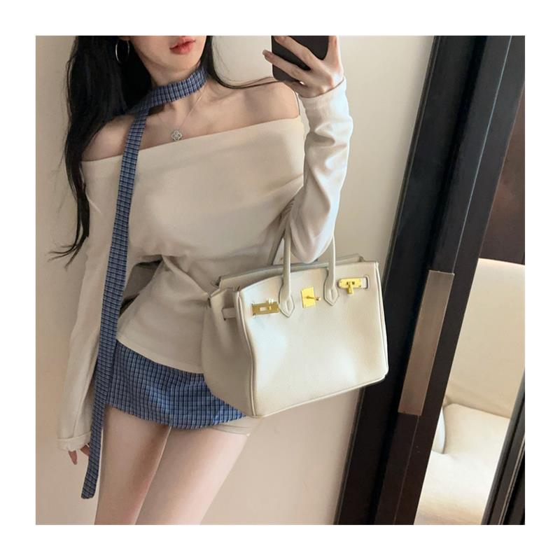 中长款一字露肩设计感长袖T恤女小众飘带内搭假两件格纹拼接上衣
