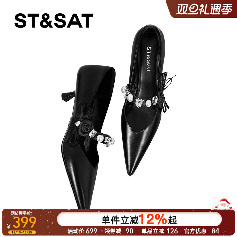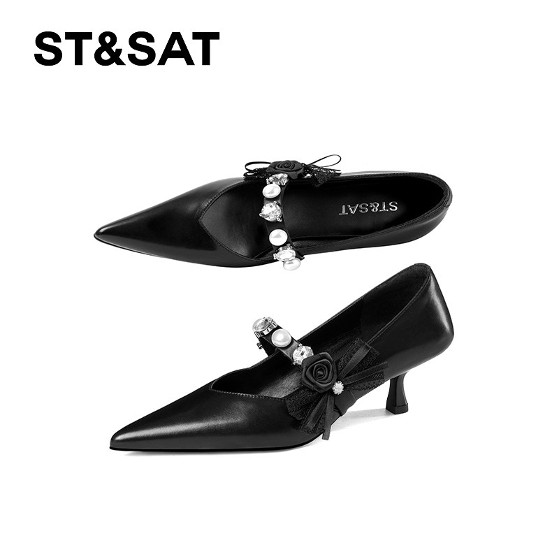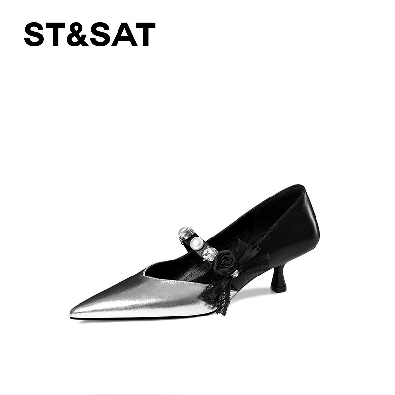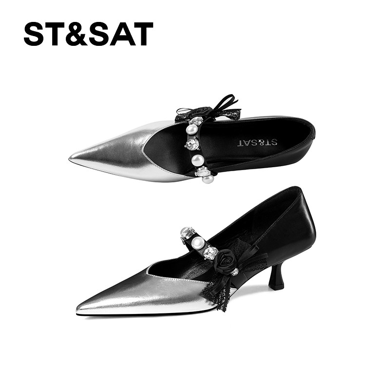 星期六银色高跟鞋女2025尖头细跟珍珠水钻单鞋蝴蝶结法式玛丽珍鞋