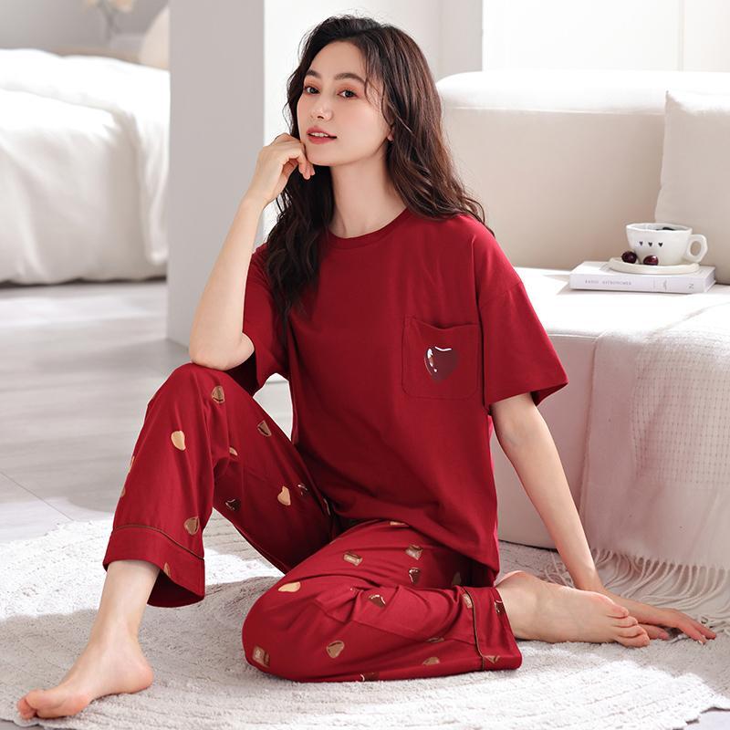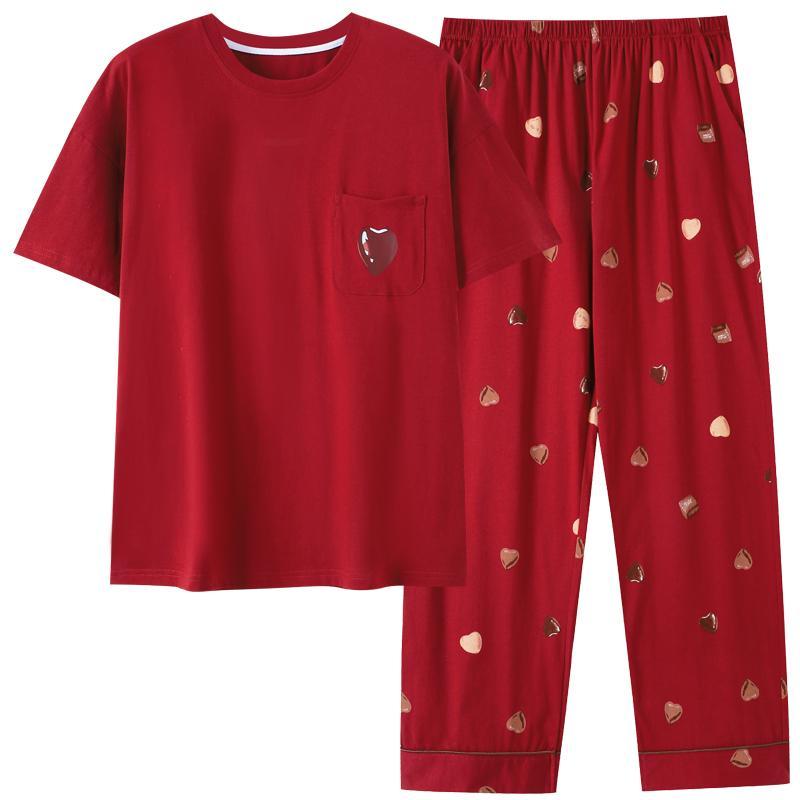 本命年睡衣女夏天纯棉短袖长裤套装大码夏季薄款大红可外穿家居服