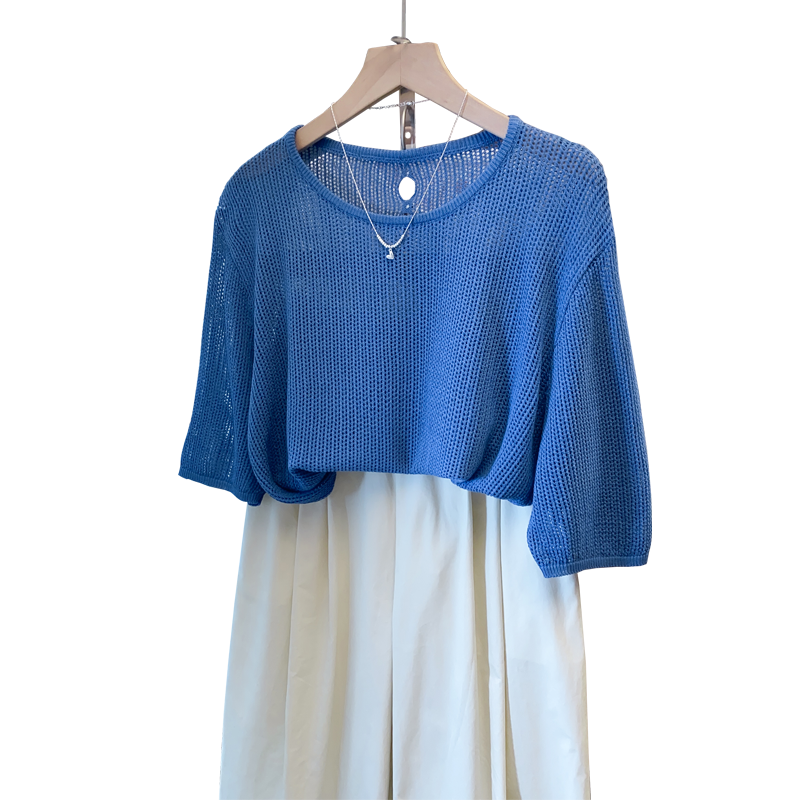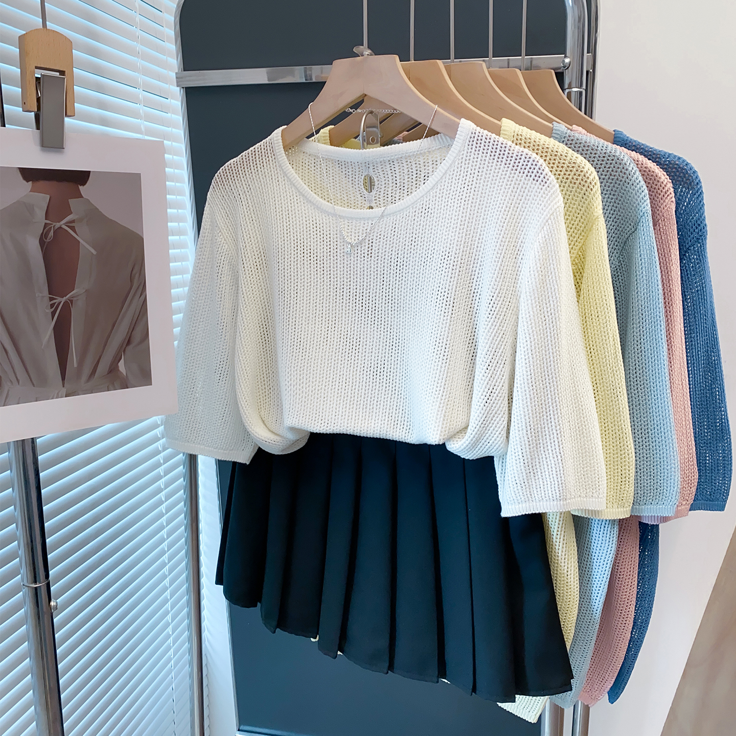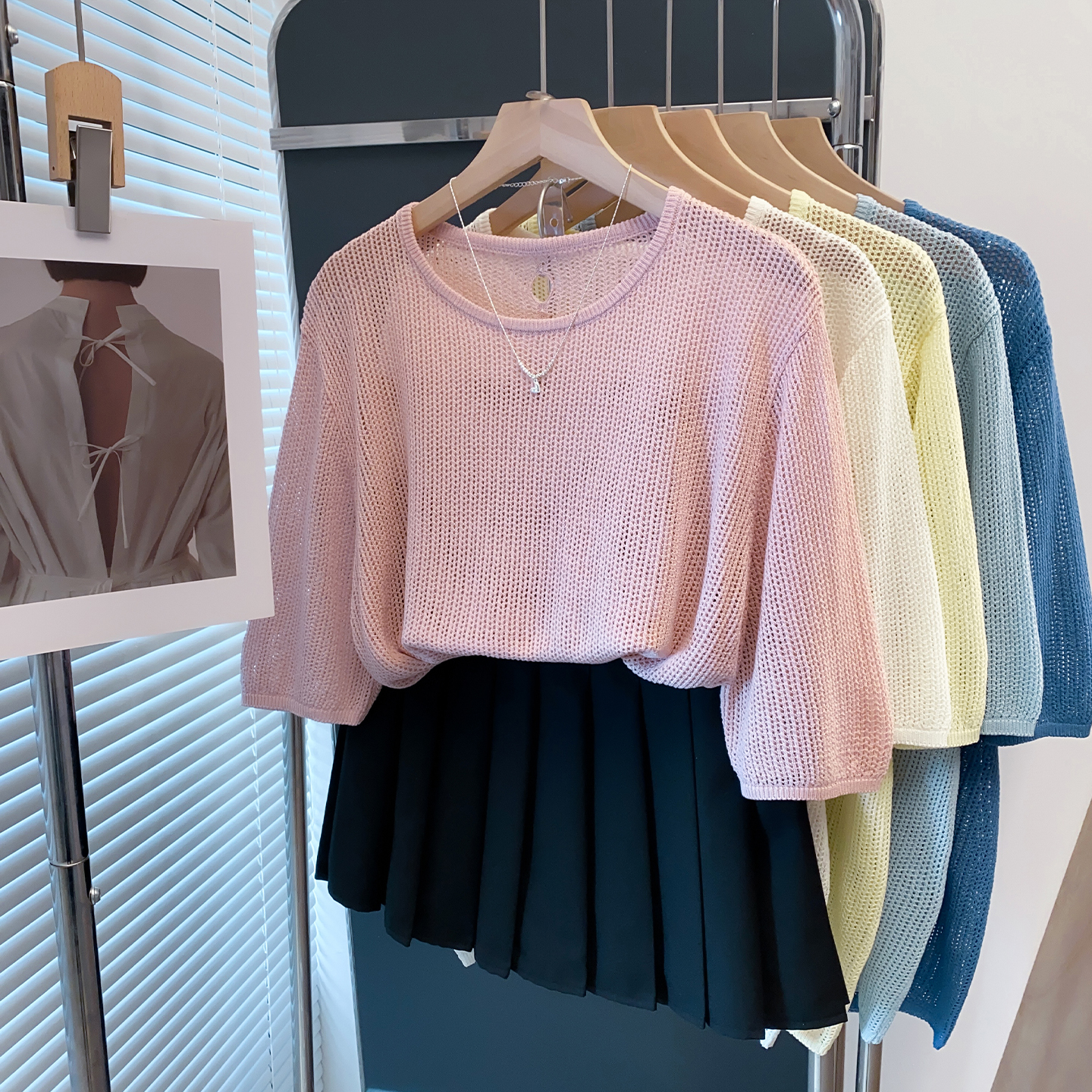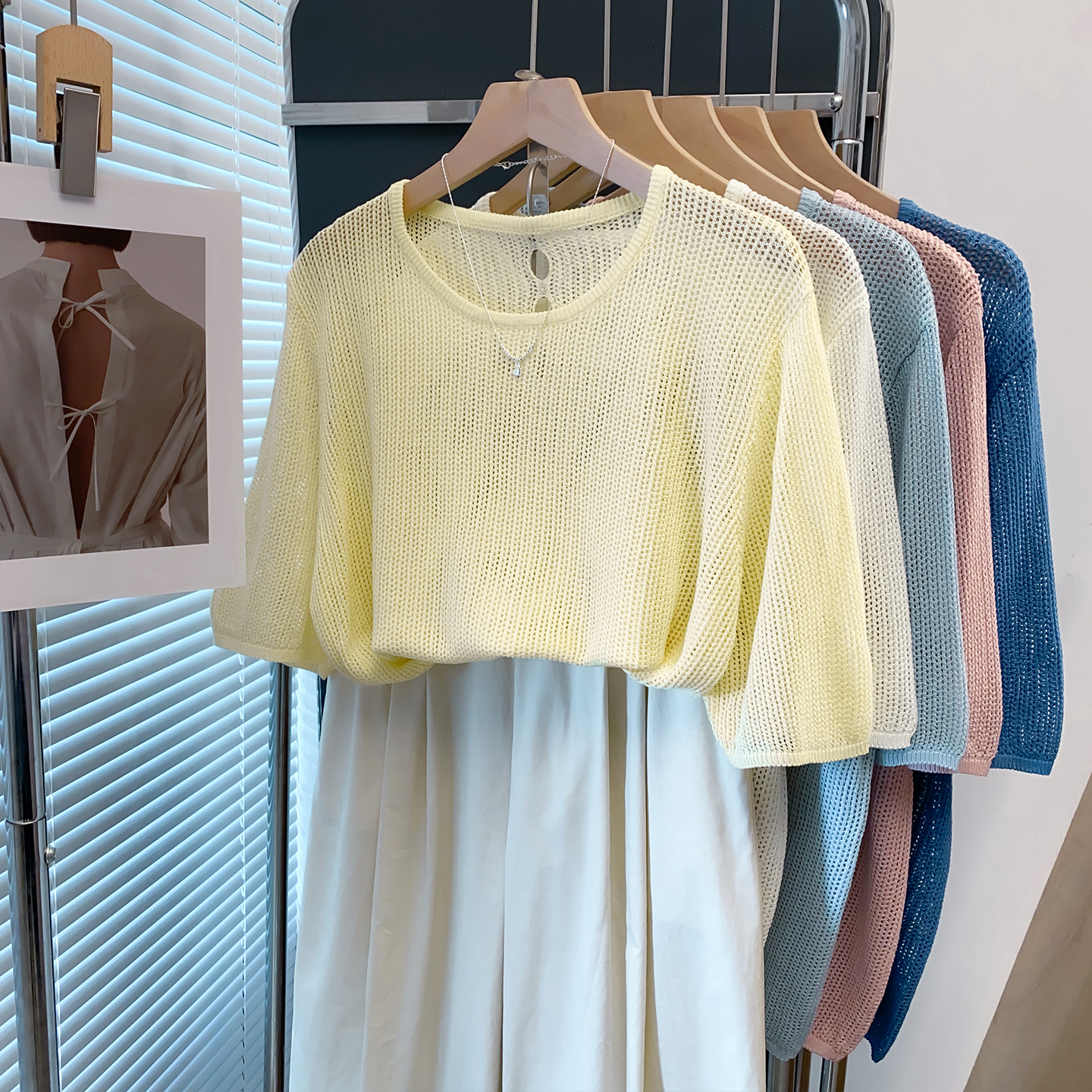 镂空圆领针织衫女2025夏装新款宽松慵懒风外穿上衣薄短袖t恤衫潮
