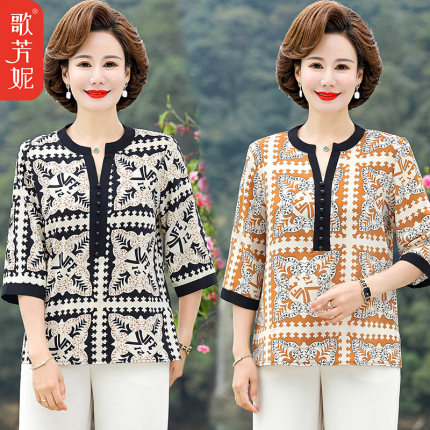 中老年女装雪纺短袖两件套装夏装中年妈妈装大码宽松洋气盘扣复古