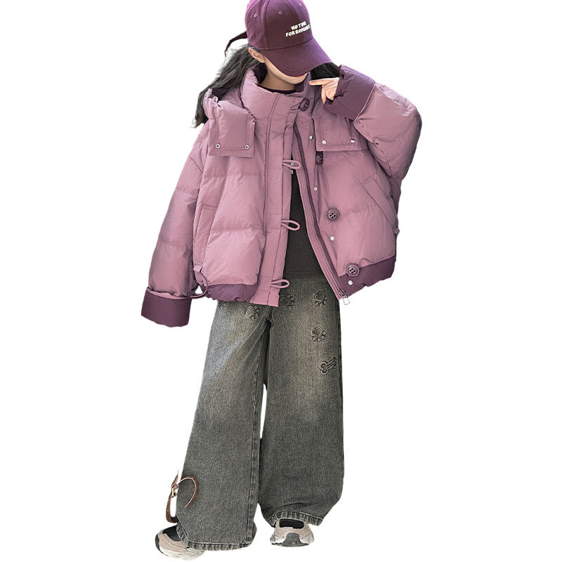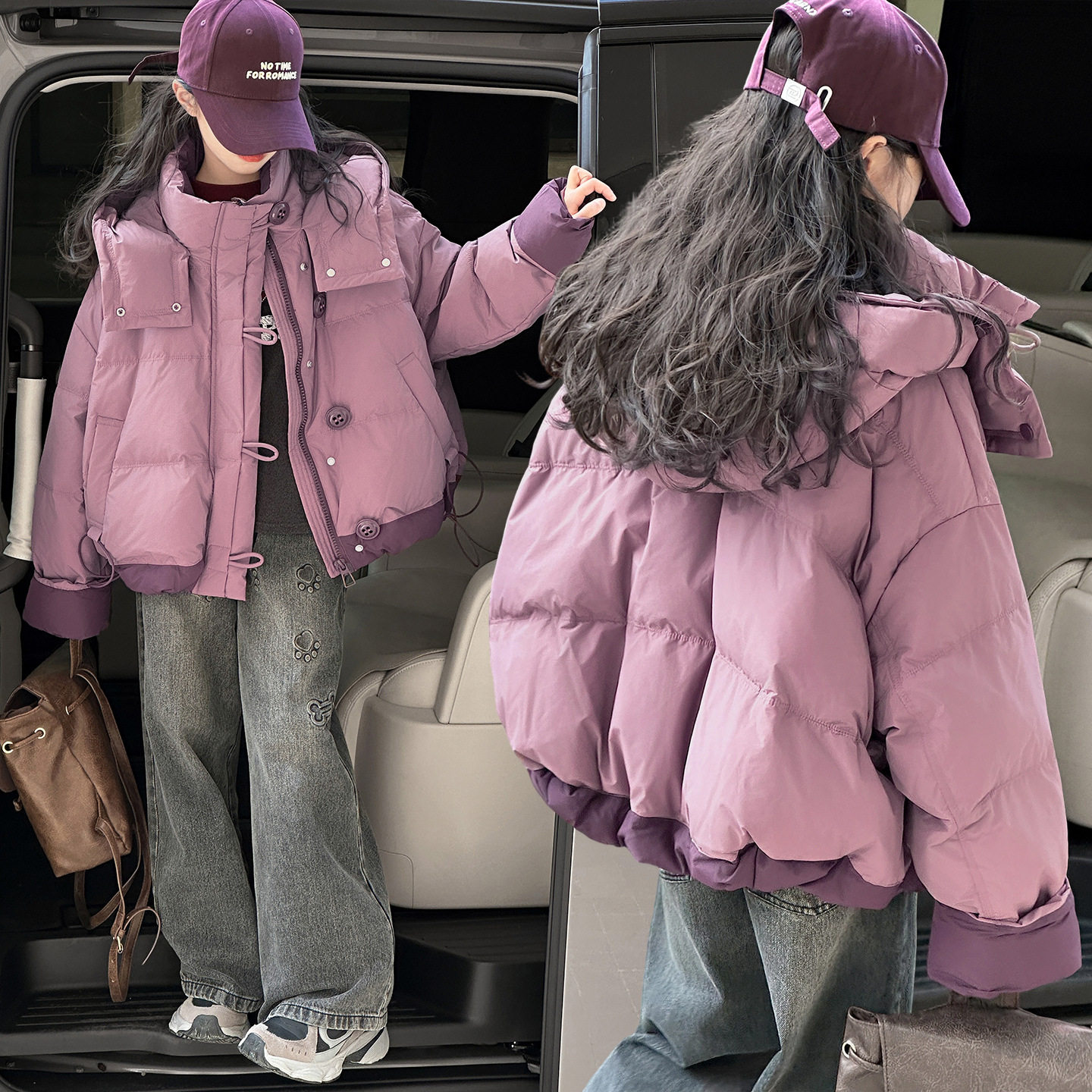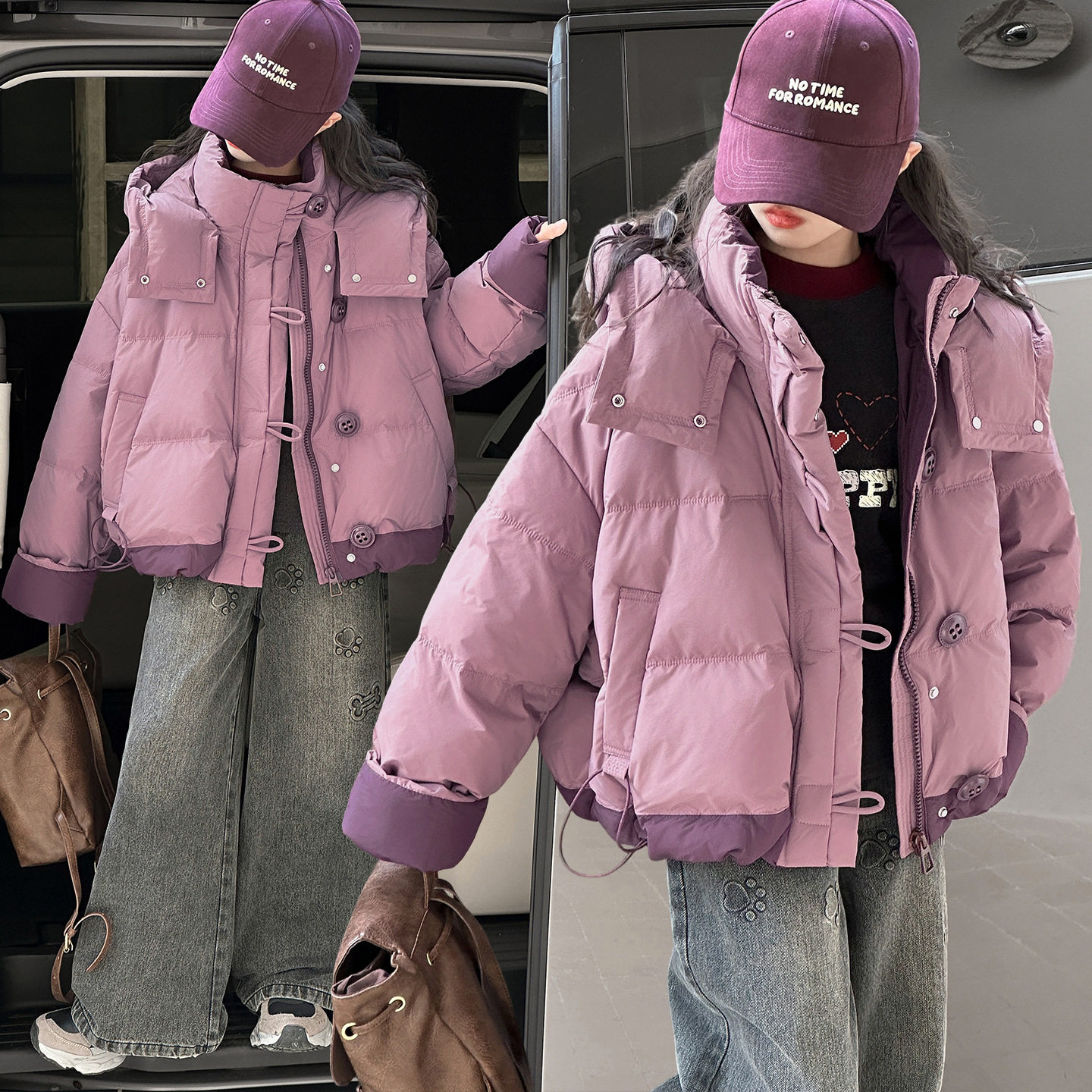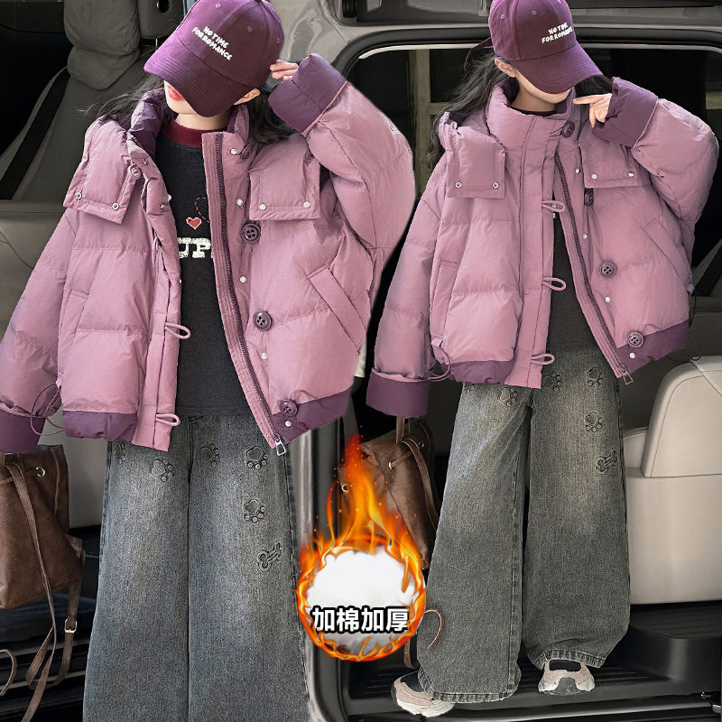 女童洋气撞色拼接紫色棉服外套连帽韩版宽松2025新款中大童面包服