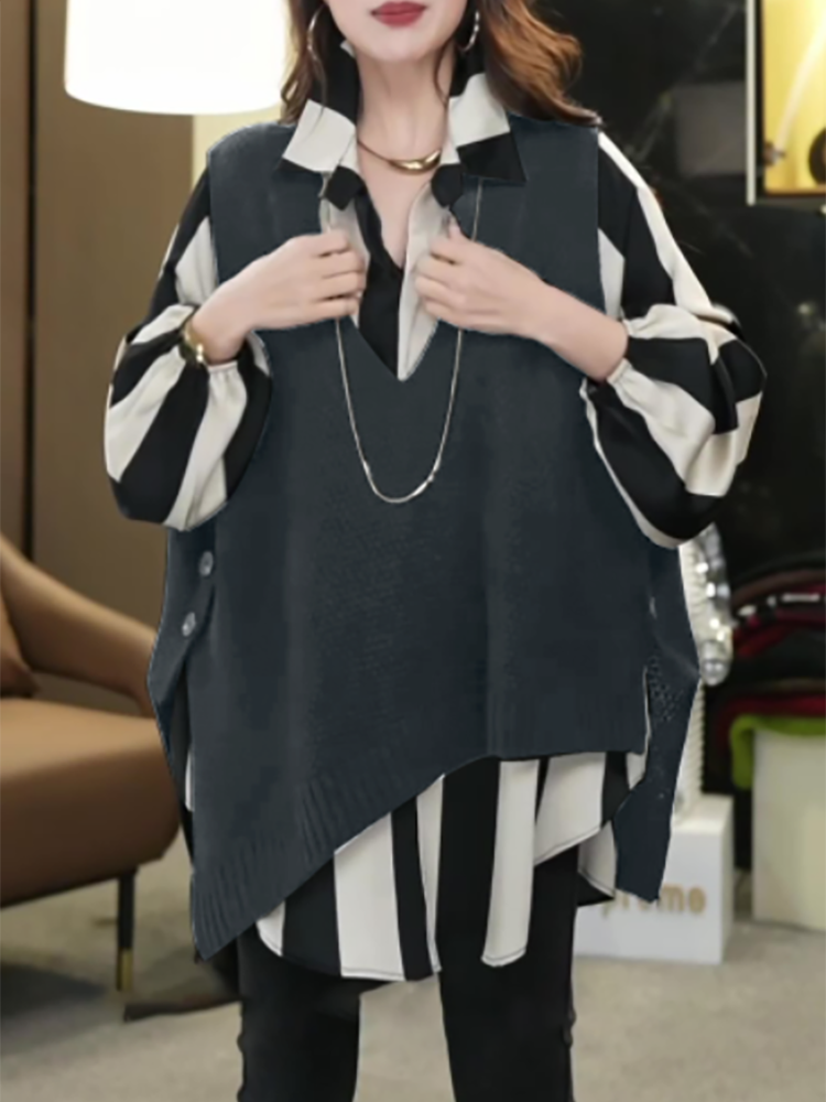 春季新款高级感时尚套装慵懒风气质条纹长袖衬衫针织马甲两件套潮