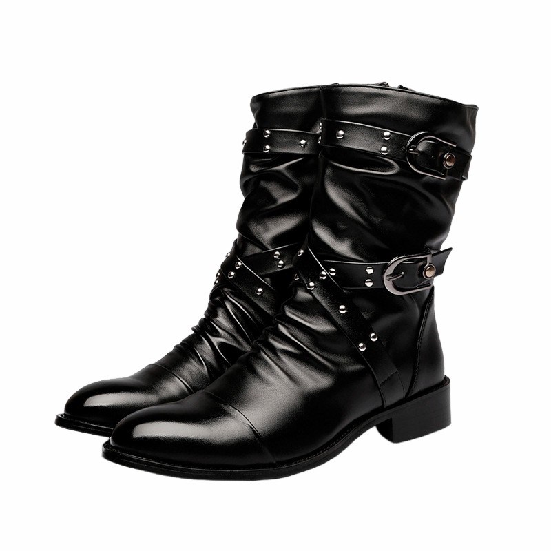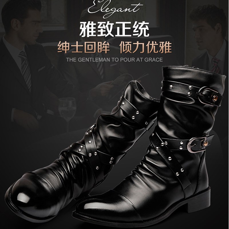 春秋季高帮皮鞋男靴中筒韩版马丁靴男尖头英伦时尚加绒保暖皮靴潮