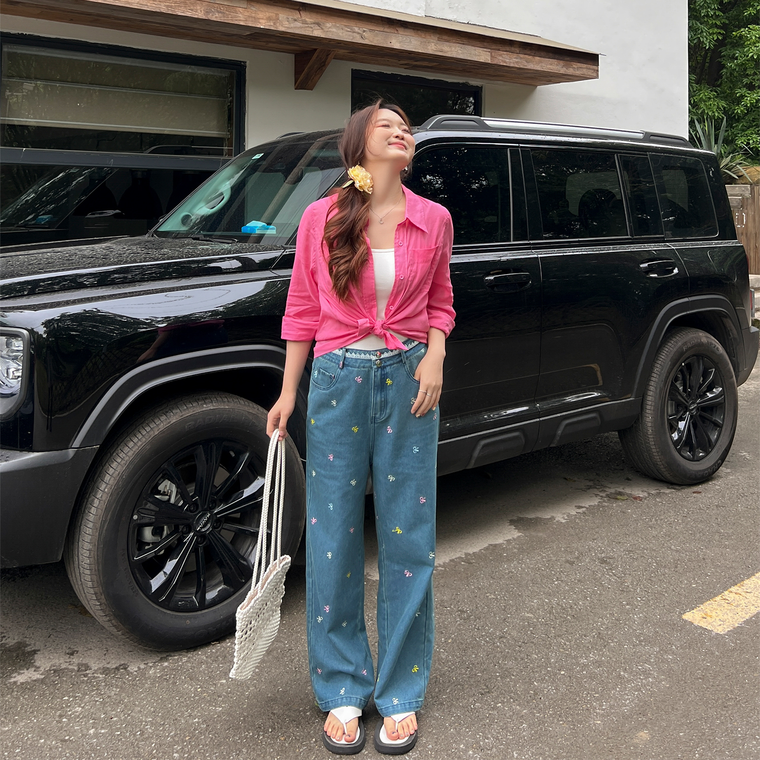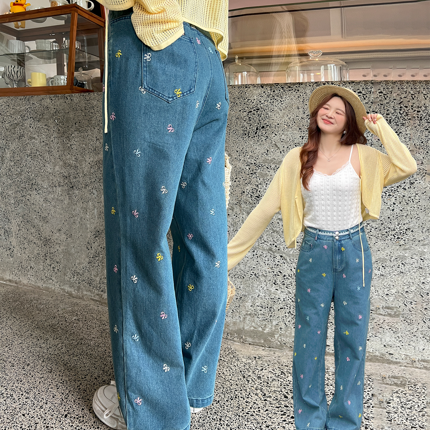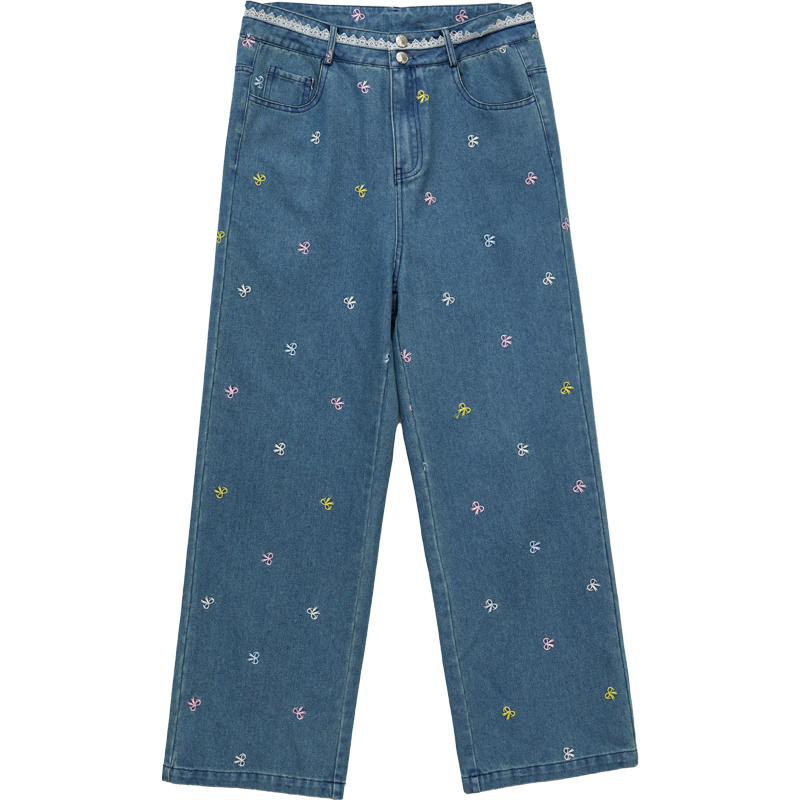 DM100大码百分百女装夏季新款胖mm显瘦直筒宽松高腰刺绣牛仔裤