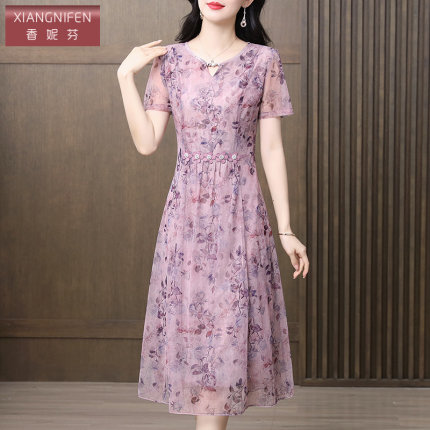 香妮芬端庄优雅中年妈妈气质连衣裙2025夏季新款v领短袖收腰显瘦