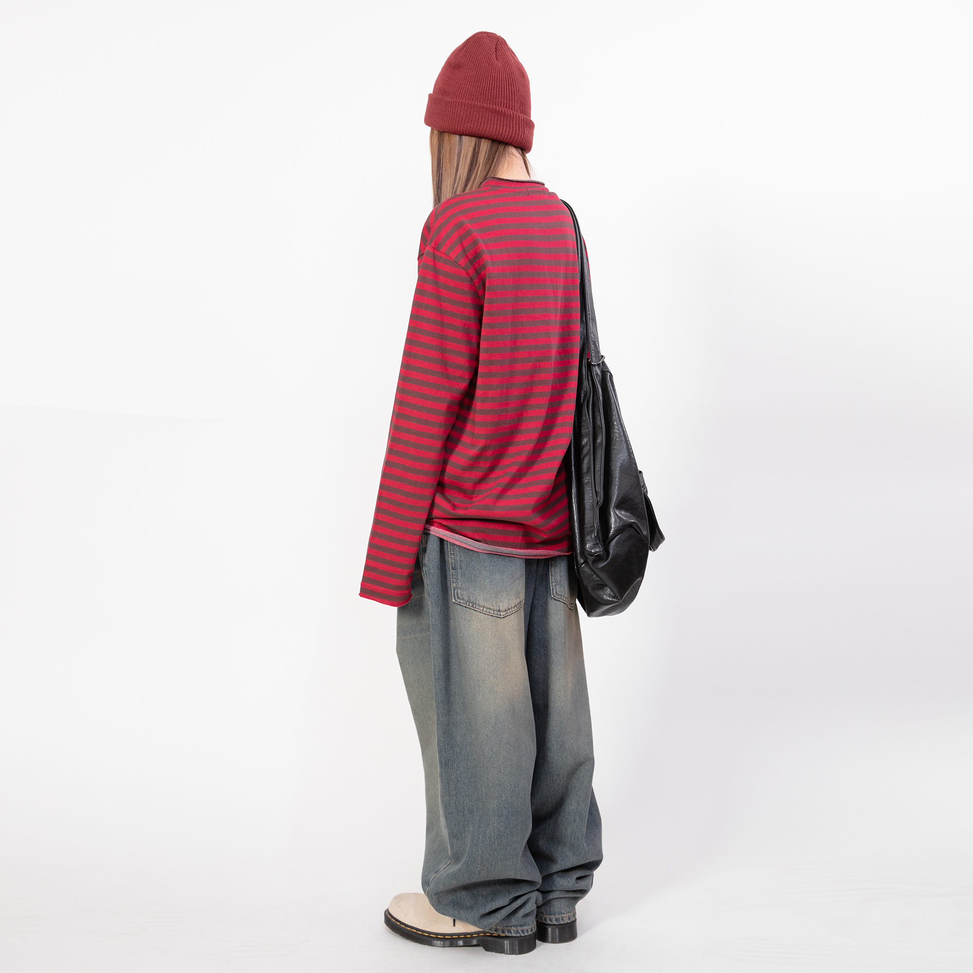 RHOMEHOUSE ins风女慵懒春秋基础宽松长袖亨利条纹T恤韩版打底