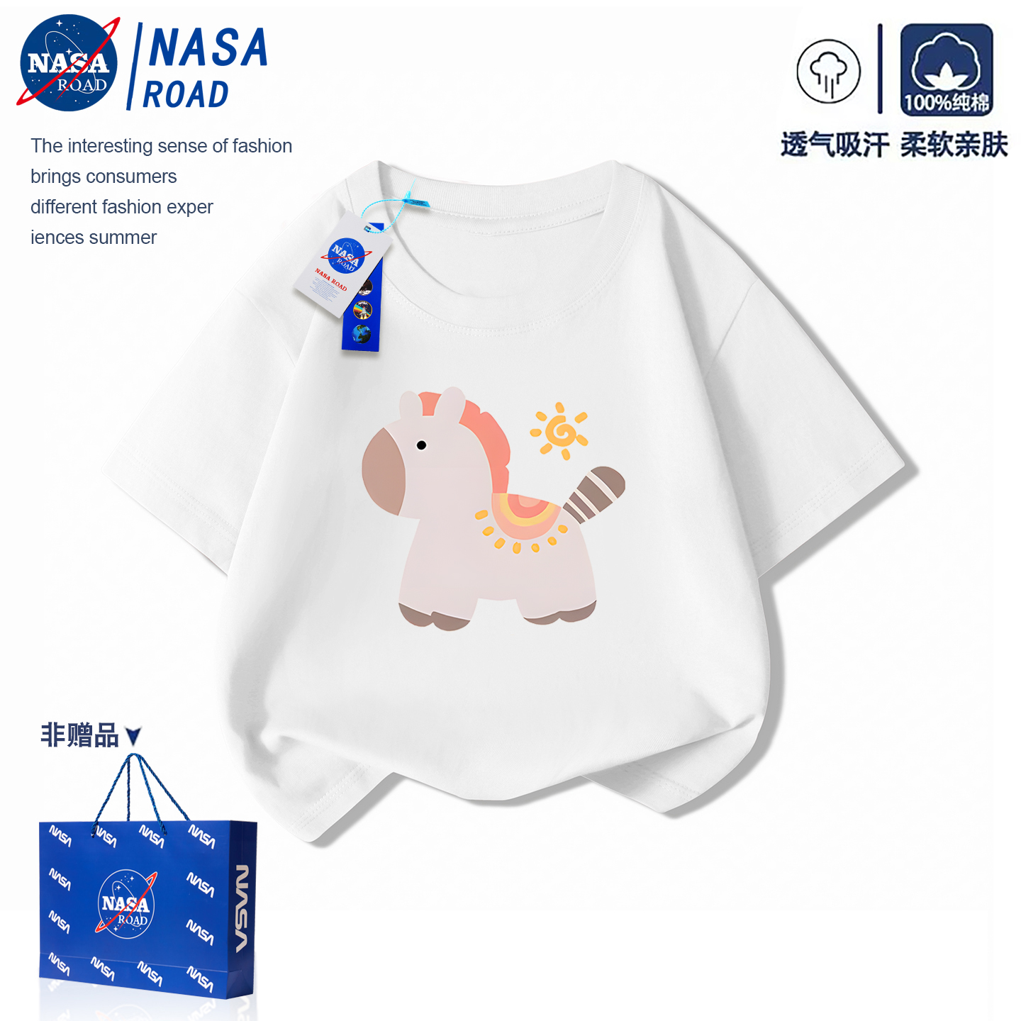 NASA红色t恤男女童纯棉短袖卡通小马2026马年本命年衣服儿童团服