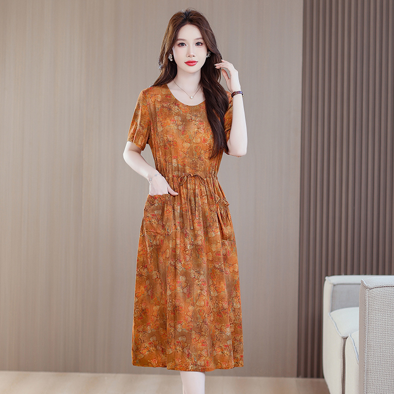 2025新款夏天短袖高级感碎花棉绸连衣裙年轻妈妈长裙有口袋显瘦