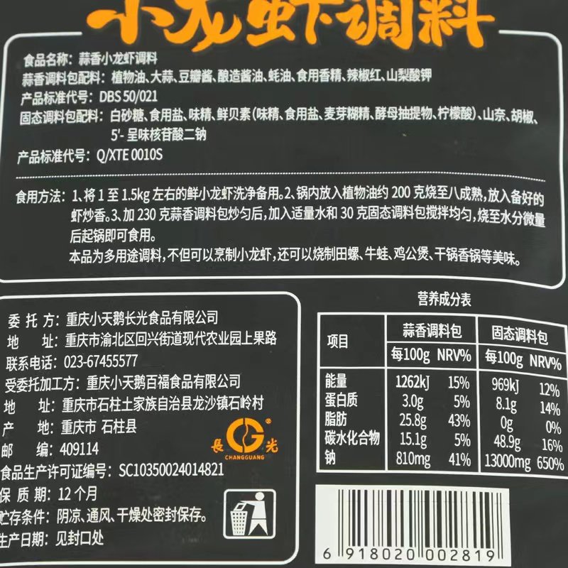 整箱小天鹅蒜香小龙虾调料260g*40袋蒜蓉油焖大虾十三香麻辣龙虾