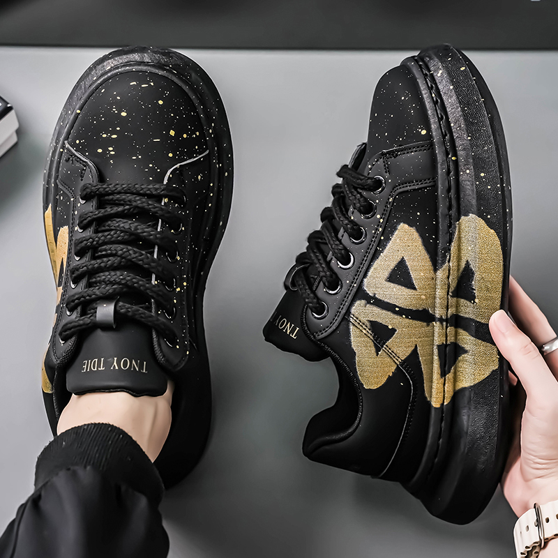 潮牌男鞋2025新款秋季休闲百搭运动厚底板鞋男士黑色工作面包潮鞋