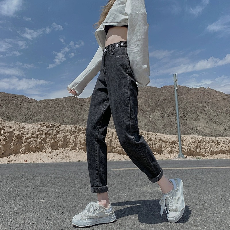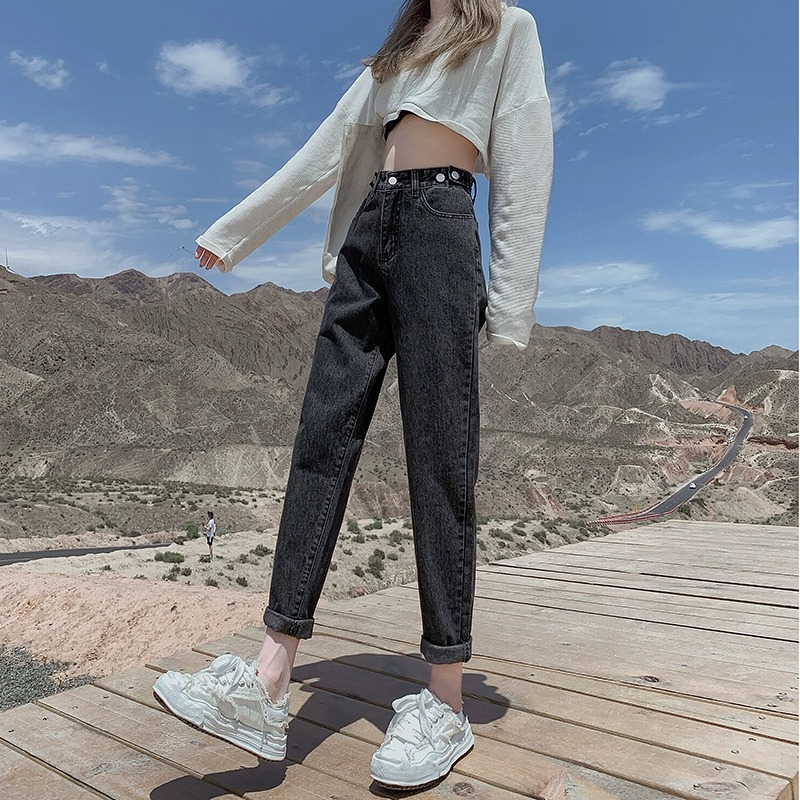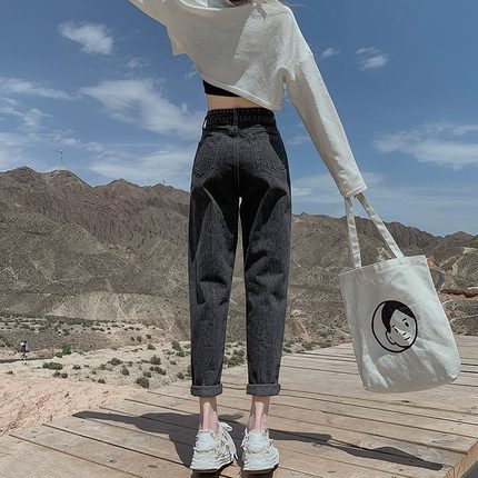 老爹牛仔裤女加绒2023年秋冬新款高腰显瘦直筒宽松显高萝卜哈伦裤
