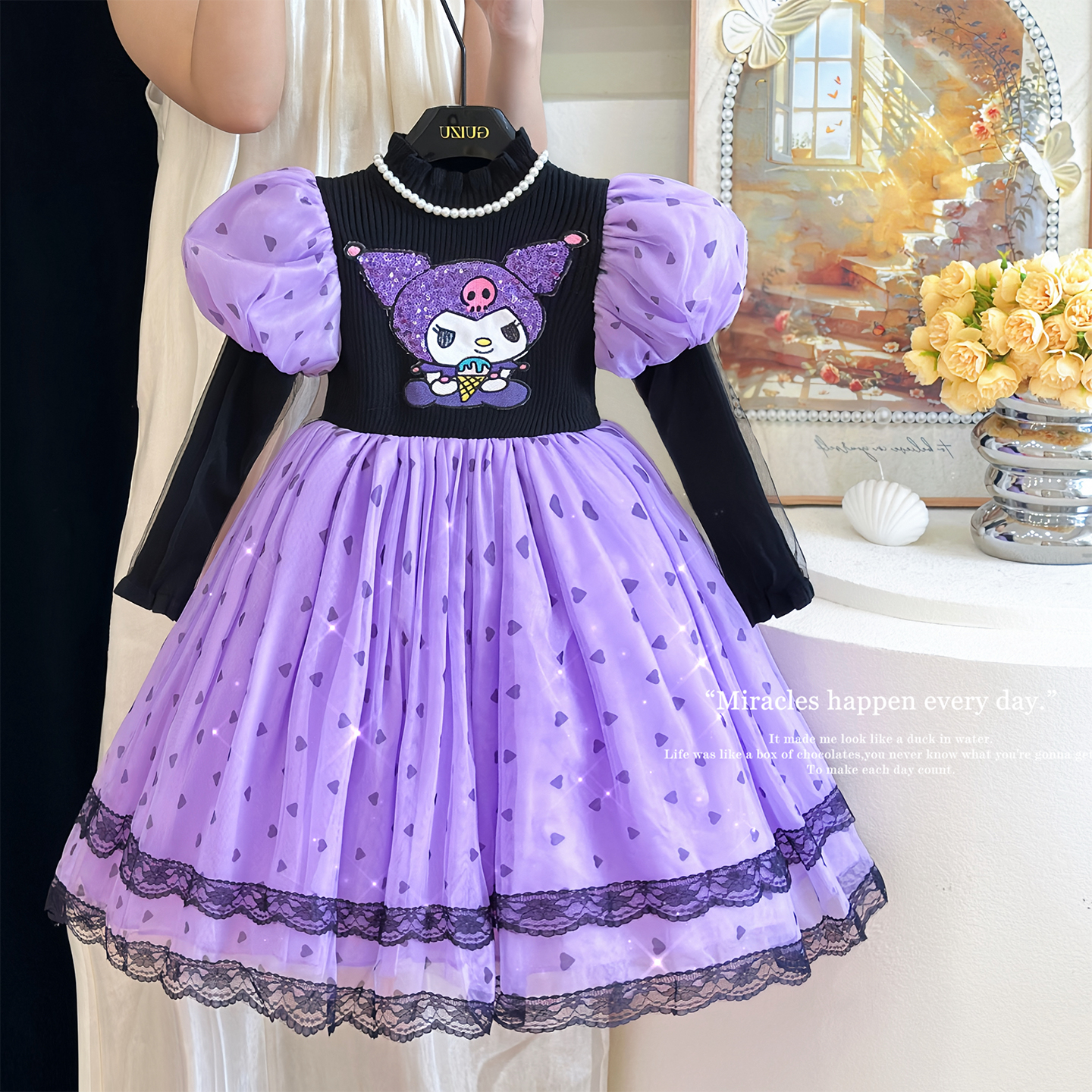 女童秋装库洛米连衣裙2025新款儿童泡泡袖毛衣裙紫色洛丽塔公主裙