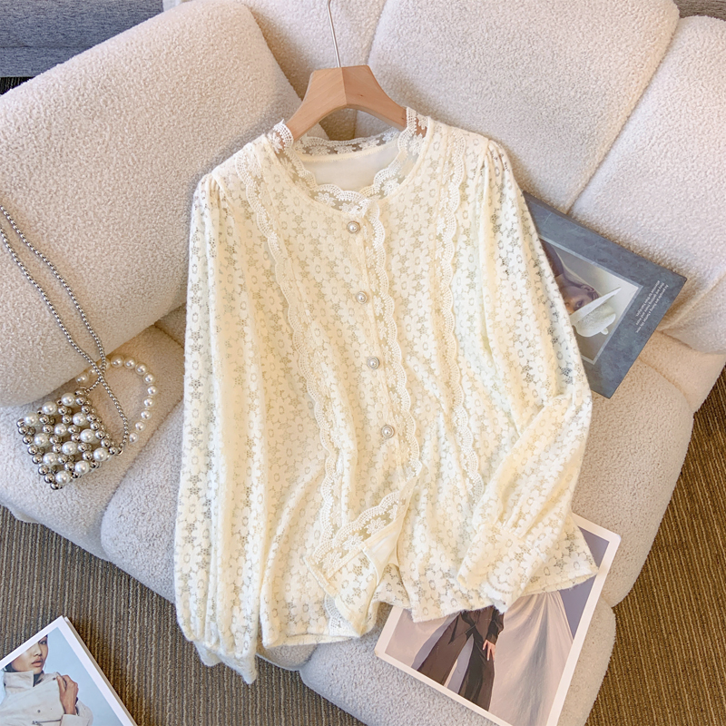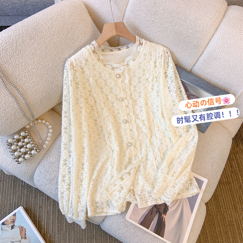 实拍2025秋冬新款蕾丝衫花边灯笼袖加绒长袖衬衫洋气打底衫女