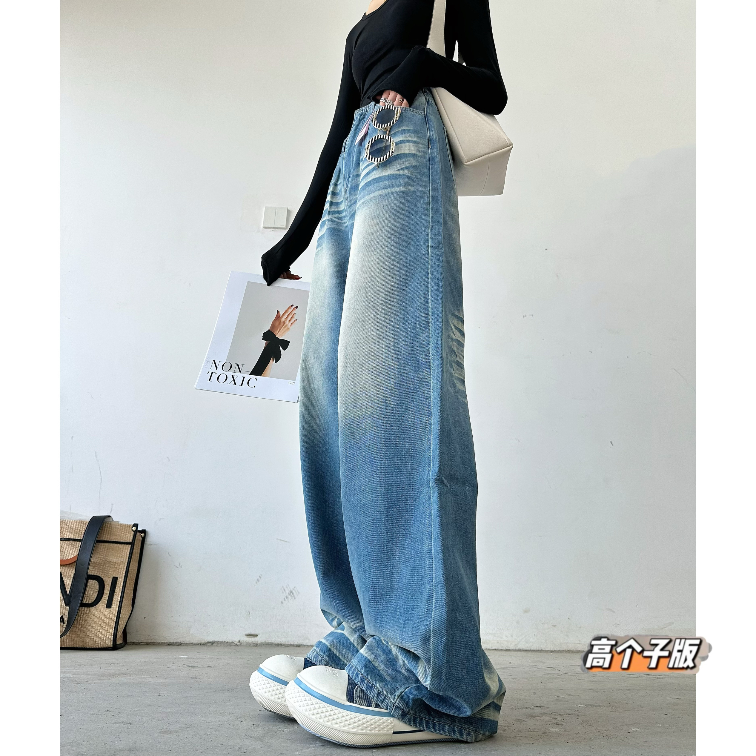 猫猫家加长女裤秋冬美式水洗复古折痕阔腿牛仔裤宽松垂直感直筒裤