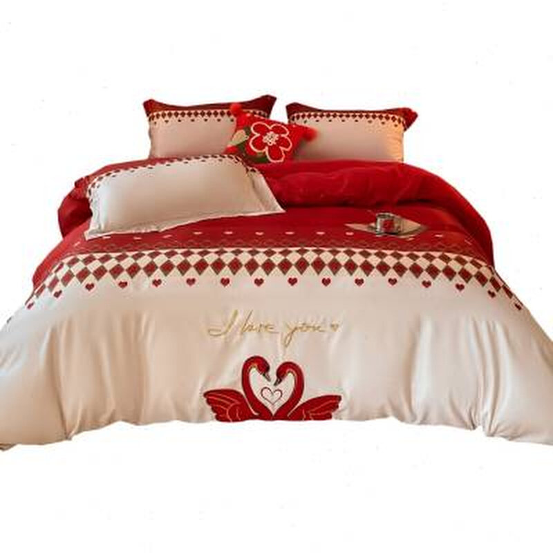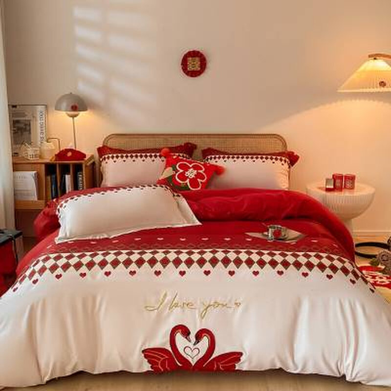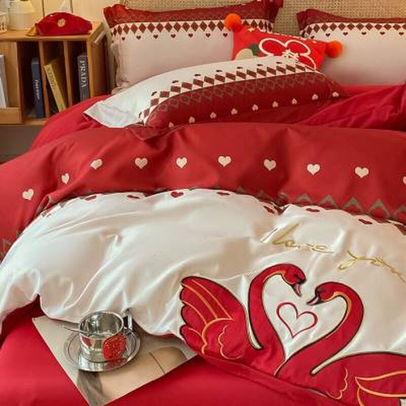 简约公主风婚庆四件组大红色被套喜被陪嫁床单结婚床上用品新婚嫁