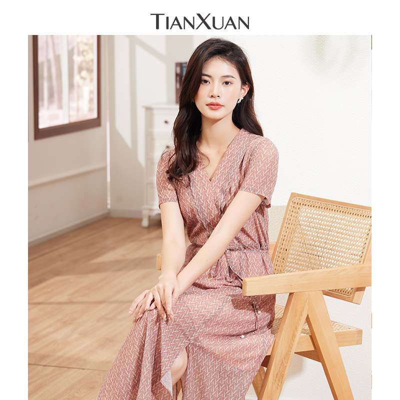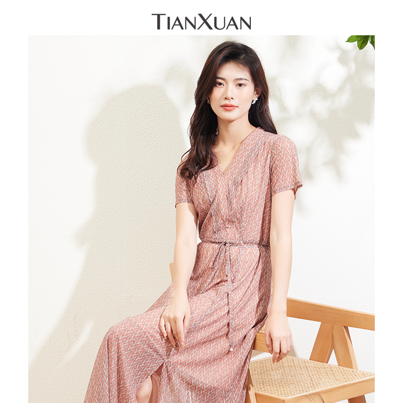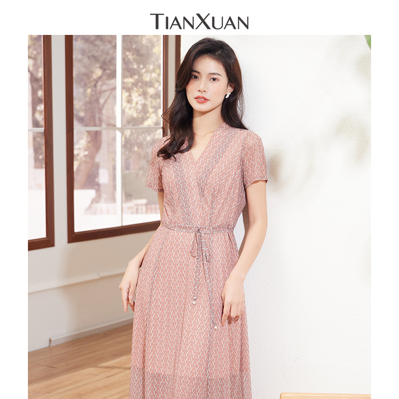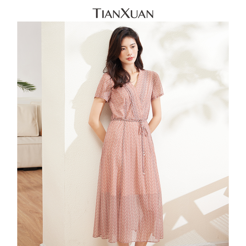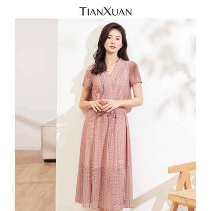 天轩商场同款夏季女士V领收腰连衣裙气质高雅名媛风新款THXD090