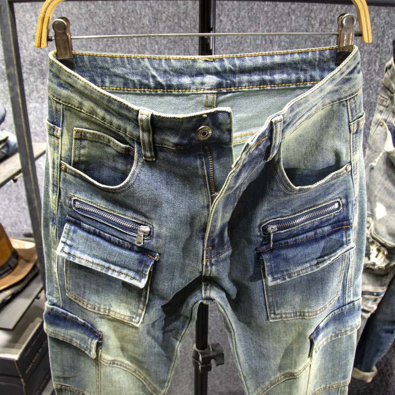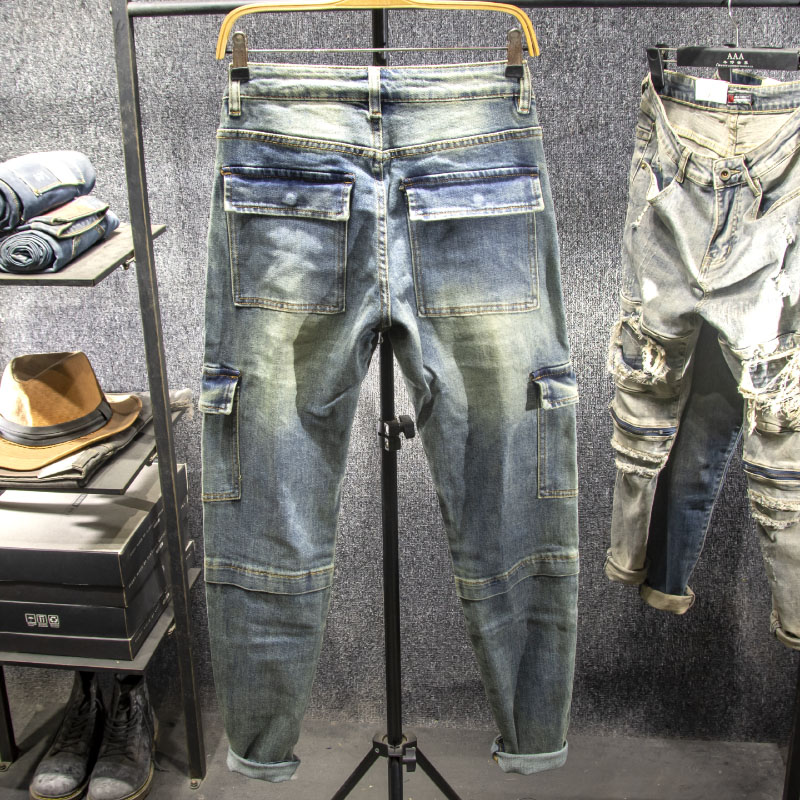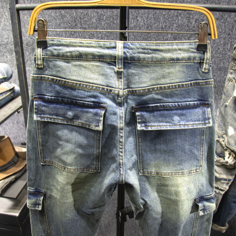 三古木棉高端多口袋牛仔裤男痞帅潮牌秋冬款工装裤子男修身小脚