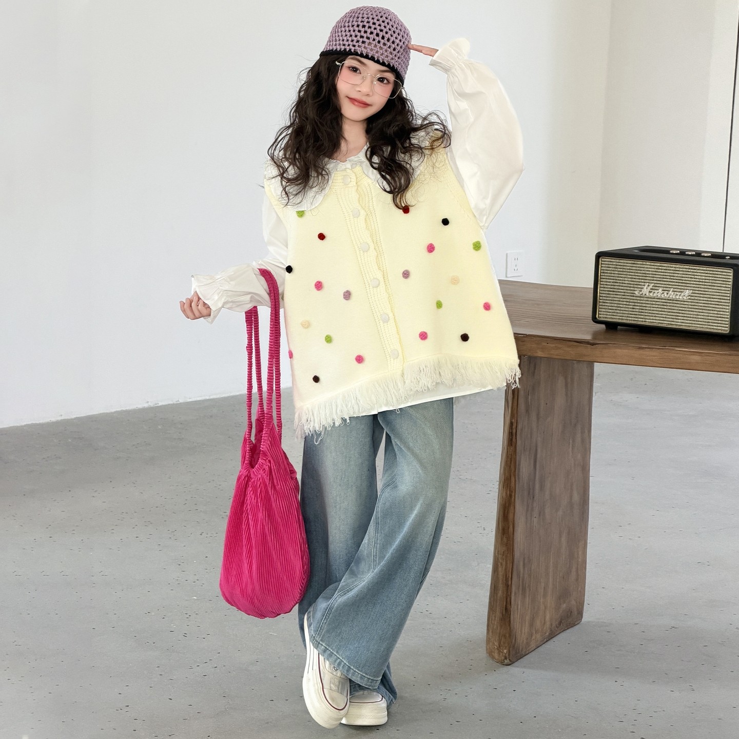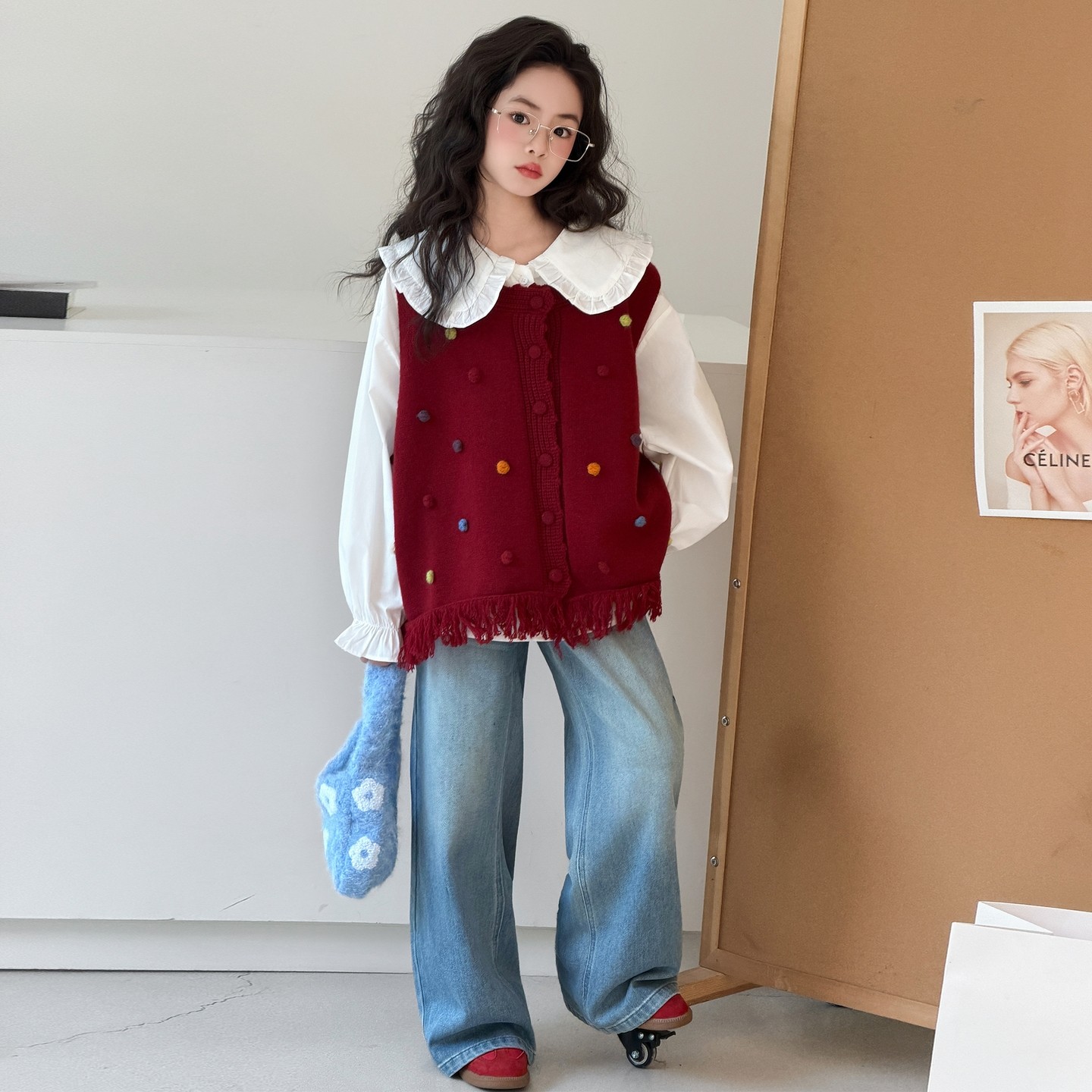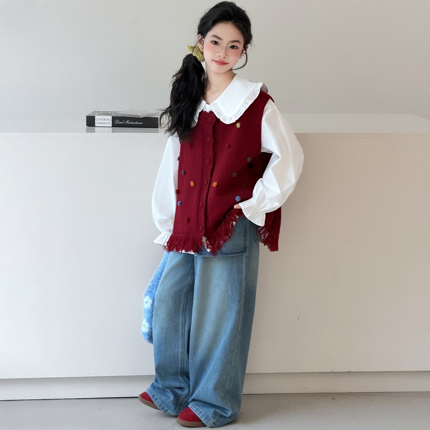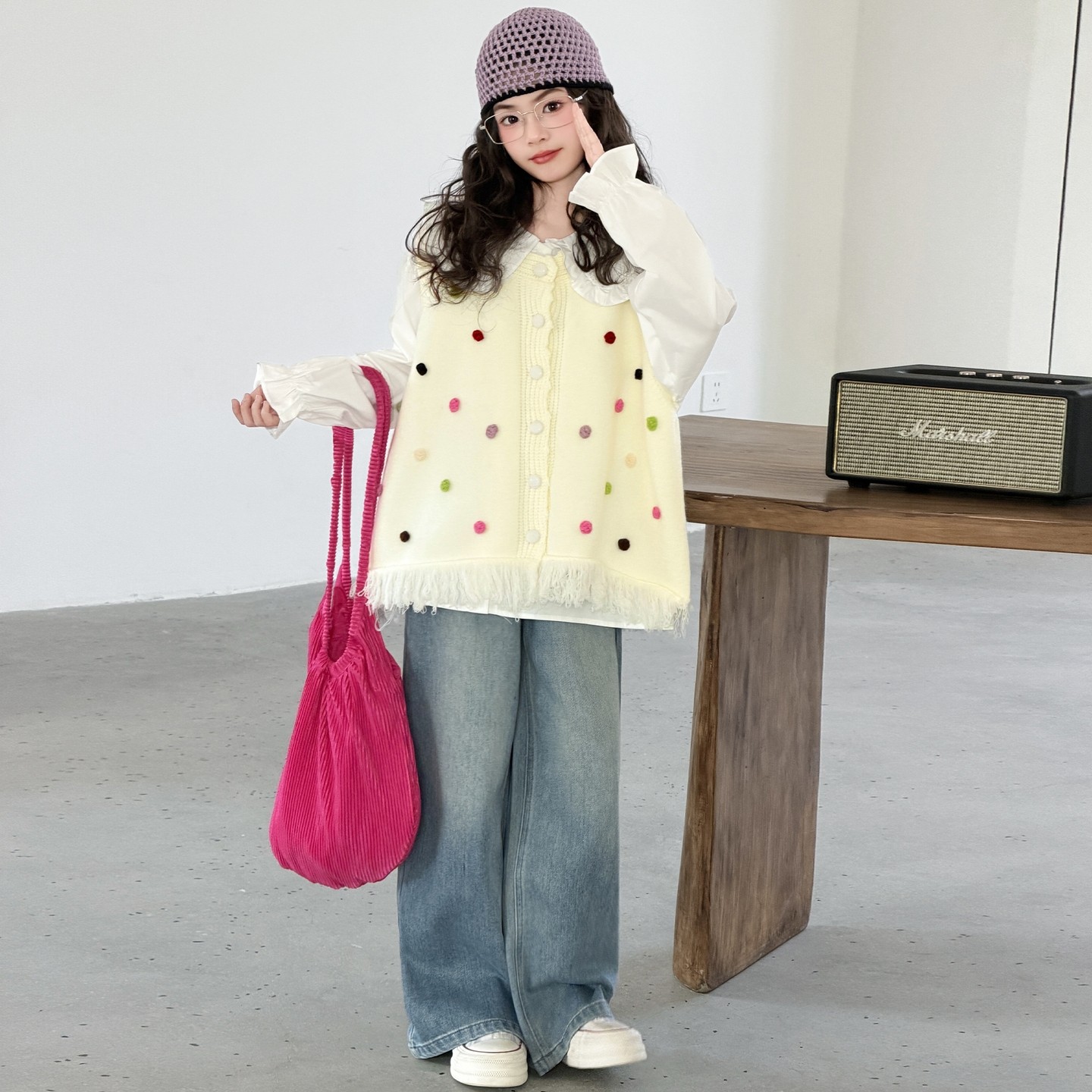 女童韩系甜美彩色球球针织马甲娃娃领衬衫牛仔阔腿裤春季三件套潮