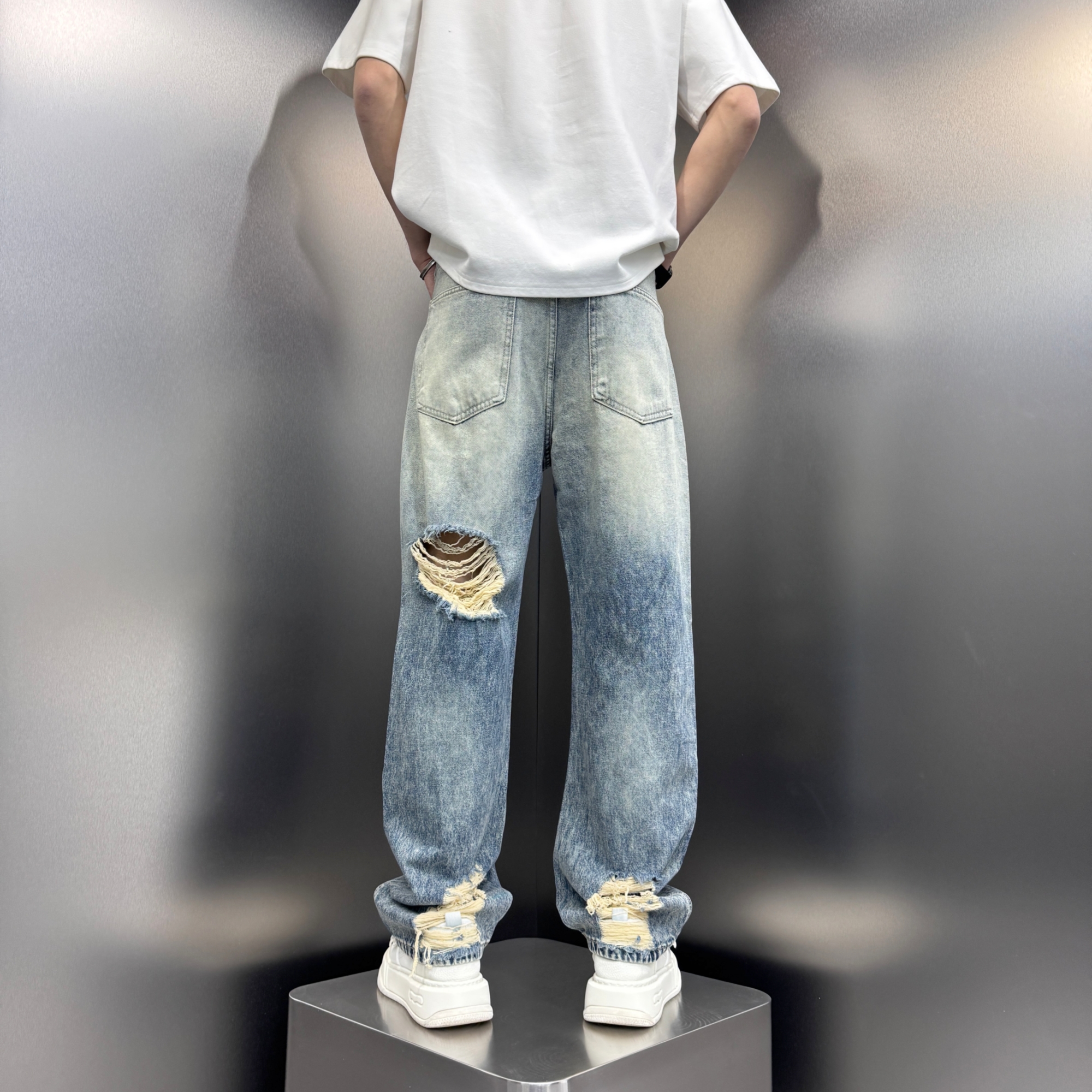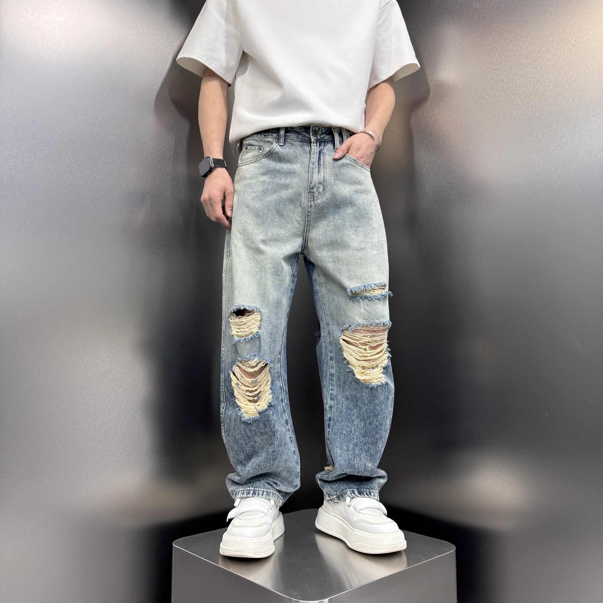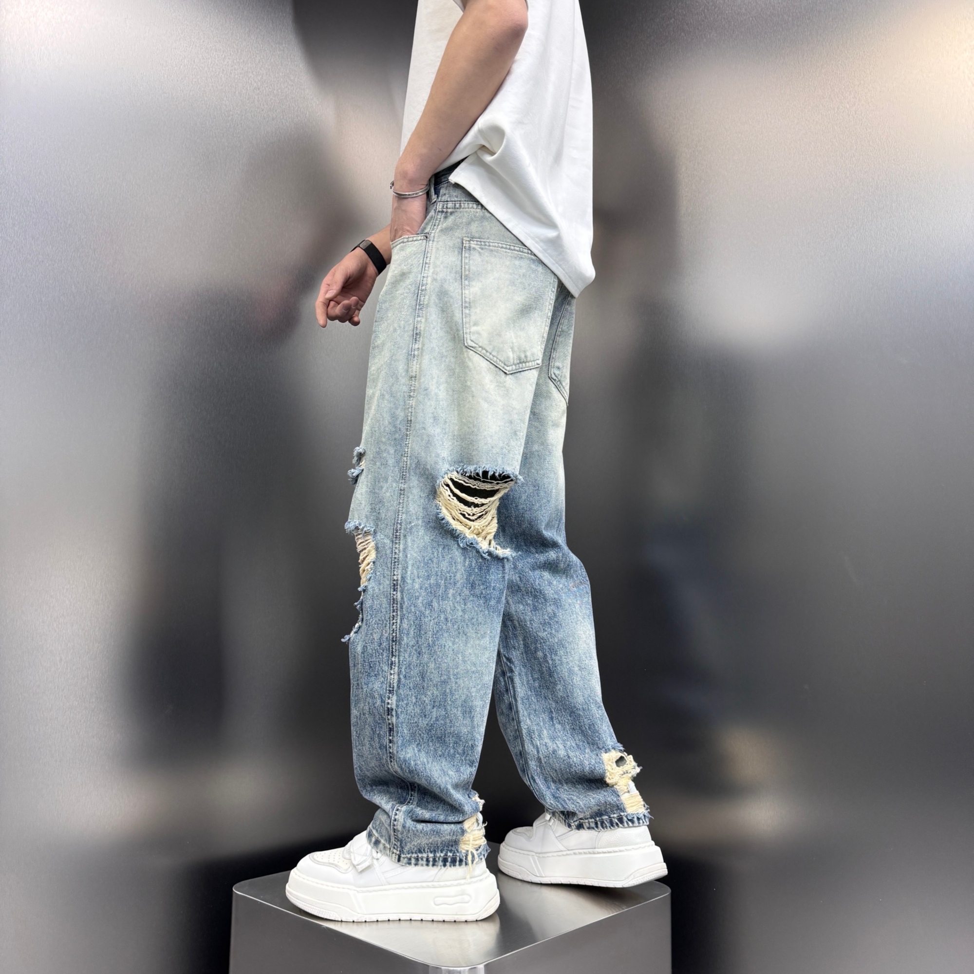 夏季新款男士美式高街乞丐破洞裤直筒牛仔裤宽松做旧水洗阔腿裤子
